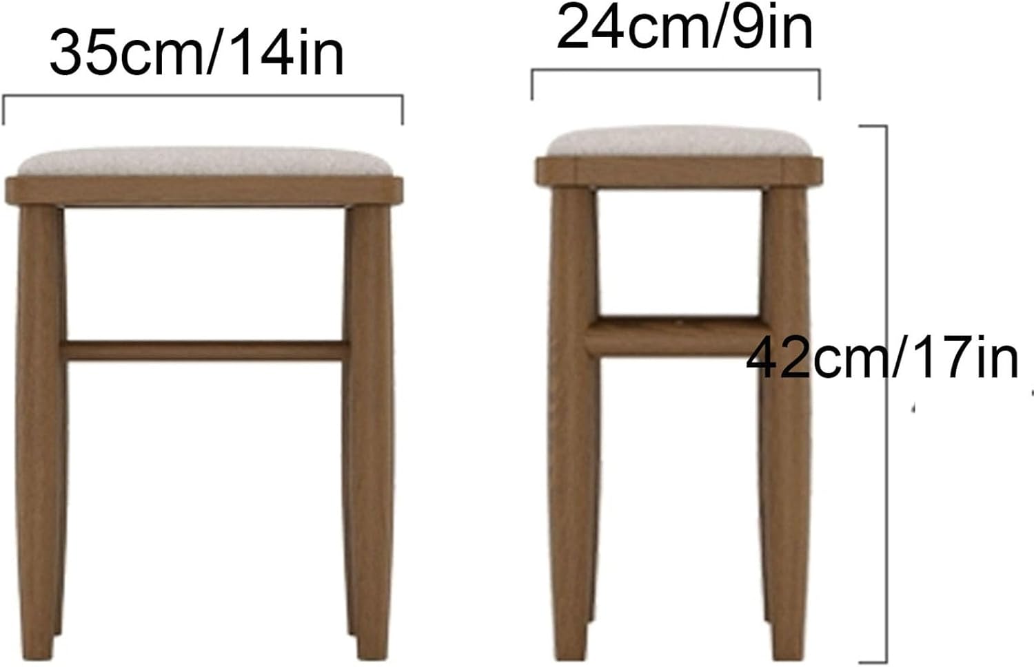 This upholstered accent chair is suitable for all occasions,for any decorating style. Whether you put the stool in the bedroom,living room,waiting room or dressing room,it is fashionable and versatile. And the makeup chairs are multifunctional,you can choose to use it as a chair for vanity desk,a footstool by the sofa or an upholstered seat in the entrance. Material: solid wood,cotton and linen fabric,spongeColor: White ,Walnut color ,Wood colorOverall dimensions: 14"Wx9"Dx17"H/35*24*42 cmMaximum load capacity: 330 lbs/150 kgPackaging gross weight: 7 lbs/3.2 kgPacking size: 20" *14" *7" /52*35*19 cmFrame material: solid woodFabric material: cotton and linen fabricFilling: sponge Dimensions are measured manually,there may be an error of 0.1-0.3",please understand. If you have any questions,please contact us via email in time,we will reply to you within 12 hours!