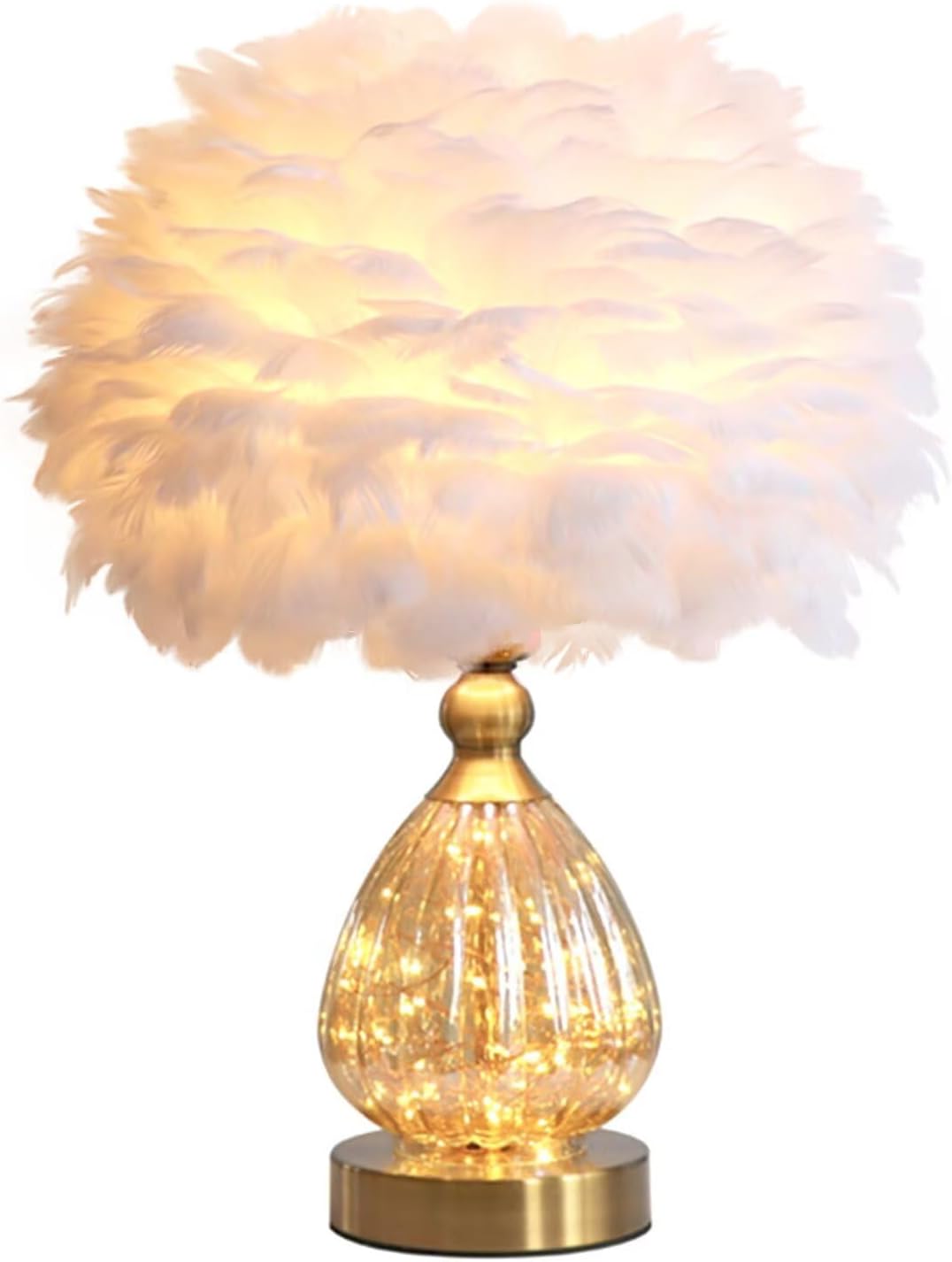 ❀❀FEATURES:▸ This is a perfect home decoration lamp that not only provides soft lighting, but also adds a warm atmosphere to your home.▸ The base is made of blown glass, with a fairy light string. When the light is turned on, the light string will also light up, very luxurious and beautiful.▸ Carefully select high-quality feathers and hand-woven into the lampshade, layered design, uniform and natural color.▸ We promise to provide the best service, no matter you have any questions, please feel free to contact us.❀❀PARAMETER:[Name]: Feather Bedside Lamp[Material]: Feather, Mental, Glass[Size]: 30CM/11.9INCH.The height of the lamp: 43CM/17.1INCH.[Base Diamater[: 12CM/4.8INCH.[LED Cap]: E27/E26[Type of Bulb]: LED light bulb, 5W, warm light[Color]: Pink Lampshade, White Lampshade, Glass And Iron Base.[Style]: Luxury Style[Switch]: Double switch, push button switch. One controls the light bulb, the other controls the light string[Shipping Weight]: 1300g[Suitable for]: Living Room, Bedroom, Bar, Restaurant, Hotel,ect❀❀PACKAGE INCLUDED:1 x Feather Bedside Lamp1 x Bulb