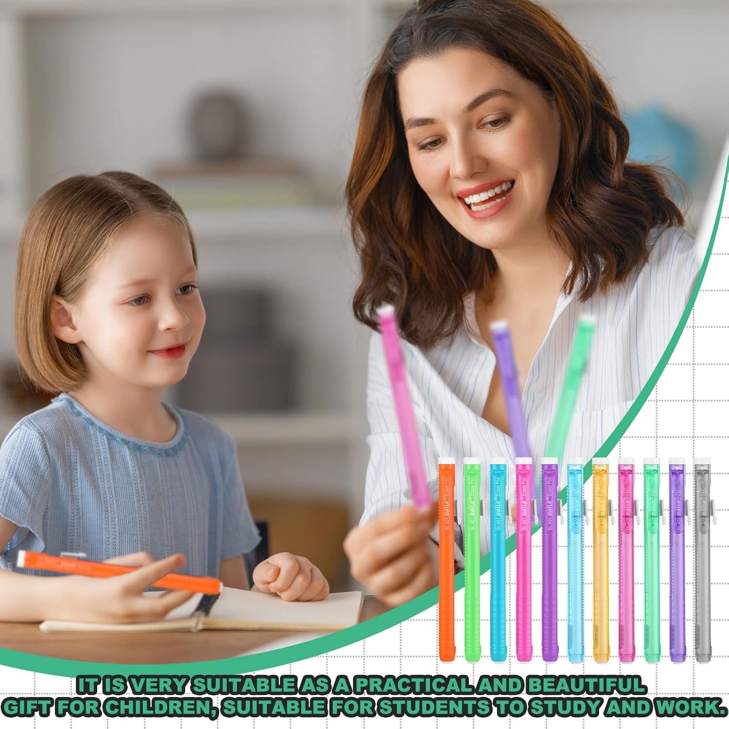 Features: The pen erasers have pen style design, so the remaining erasers can be seen clearly. Also, you can buy erasers to refill the pen erasers when you use up the erasers. The mechanical erasers can be applied for erasing mistakes on notes, books and any place written in pencils. They are suitable for students, children, teachers, workers in school, office, and any place you need. Specifications: Material: plastic (the out shell), rubber (eraser) Color: colorful Size: 5.1 x 0.47 inch /13 x 1.2 cm Package includes: 96 x Retractable eraser pens Notes: Manual measurement, please allow slight errors on size. The color may exist a slight difference due to different screen displays. Please notice that the pen erasers can erase the pencil marks instead of pen marks.