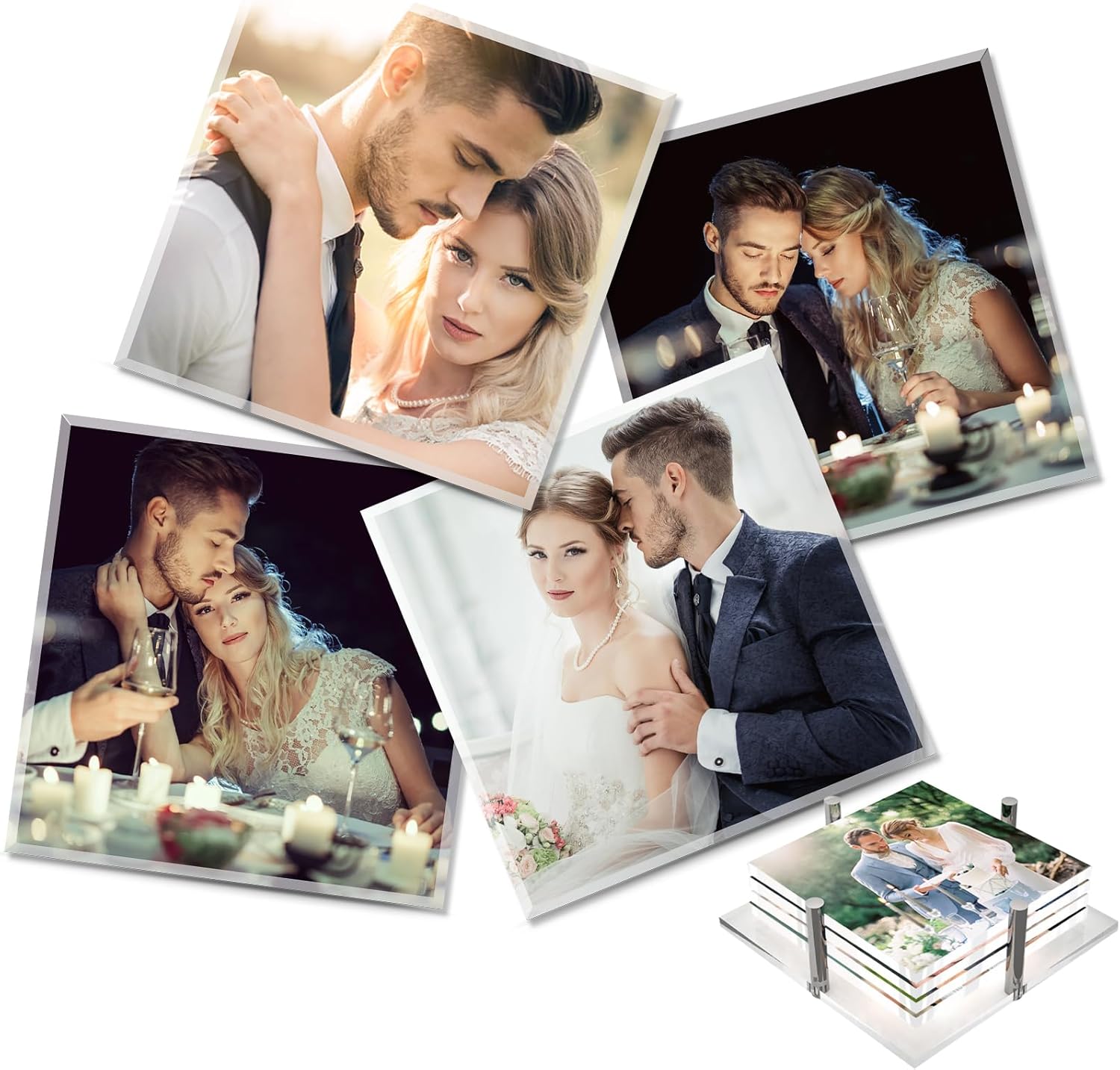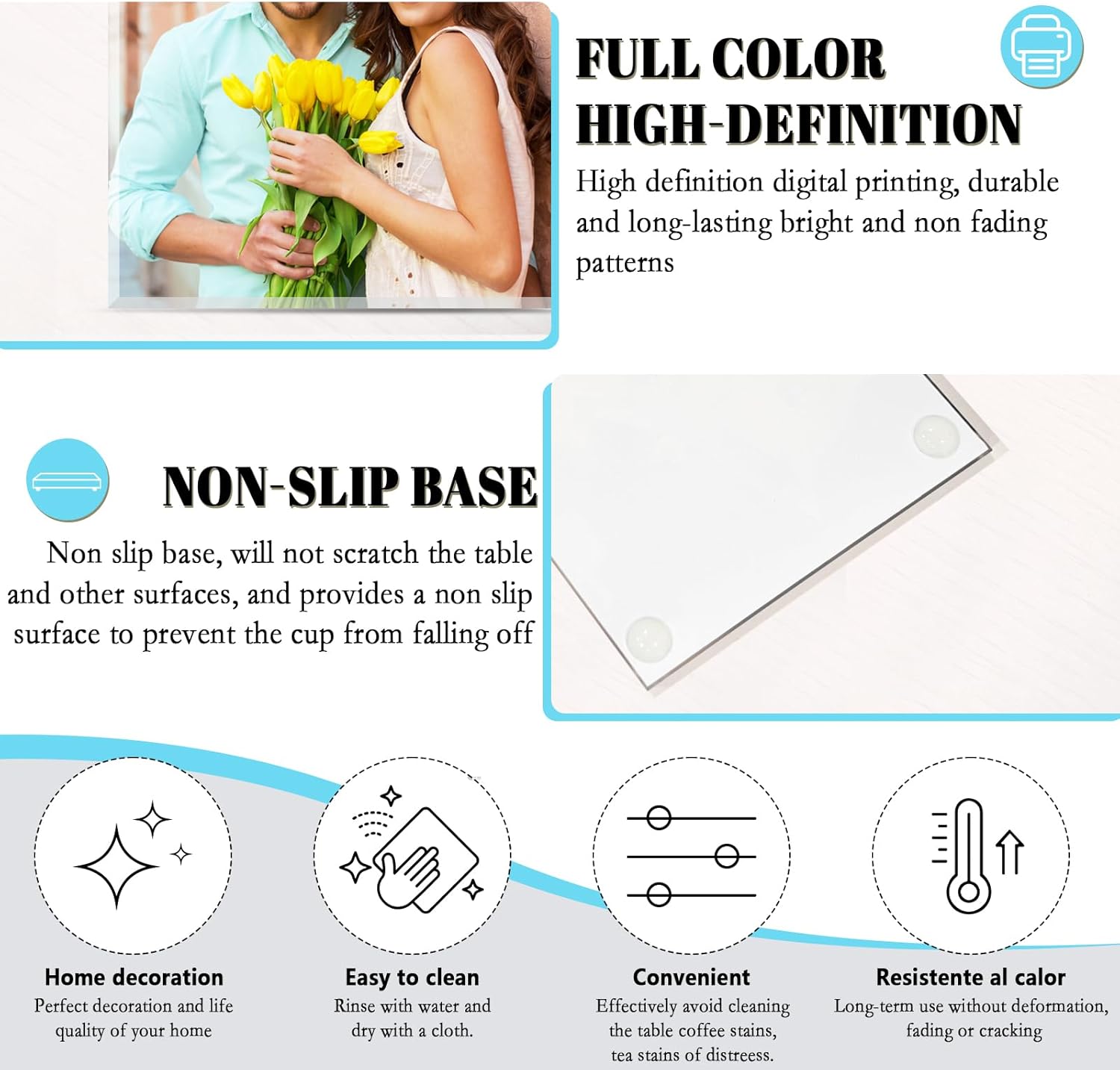 Create unforgettable moments with our custom coasters personalized set. This premium custom glass coasters set of 4 allows you to print photos, artwork, names or special messages in vibrant full color. Unlike ordinary drink coasters, our picture coasters are crafted from high-quality glass with a natural glossy finish and smooth touch. Each design is carefully reviewed and refined by professional designers to preserve image depth, clarity and color accuracy. These personalized drink coasters are waterproof, fade-resistant and easy to clean, making them ideal for everyday use at home, coffee tables, offices or special occasions. Whether you’re looking for a thoughtful anniversary personalized gift, a romantic couple’s keepsake, or a unique birthday or wedding present, these custom coasters transform meaningful memories into functional art.
