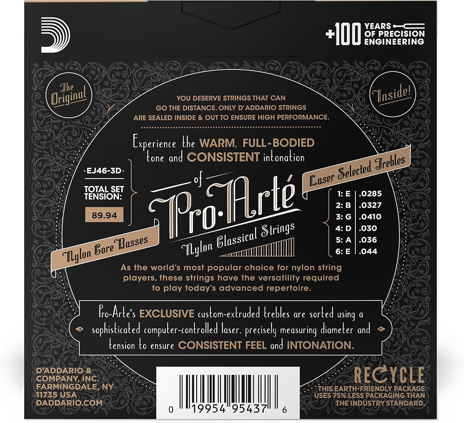 Product Description Rooted in generations of D’Addario string making expertise, Pro-Arte’ Nylon is our archetypal classical set. The bass strings are made with a multifilament nylon core and wound with silver-plated copper, for an exceptionally warm and consistent response. Coupled with clear nylon treble strings, which deliver sweet, mellow highs, Pro-Arte’ Nylon gives you the sound and feel that has come to define classical guitar. From the Manufacturer EJ46, hard tension, is a popular choice for its rich tone, increased resistance and strong projection. Buy 3 sets and save!Pro-Arte, the world's most popular classical strings are D'Addario's premium classical guitar string sets. All Pro-Arte treble strings are sorted by a sophisticated computer-controlled laser machine which performs diameter and tension measurements, ensuring true-sounding, precise trebles in every set. Pro-Arte basses are wound using silver-plated copper on a multi-filament nylon core for consistent and warm, yet projecting tone.D'Addario, the world's largest manufacturer of musical instrument strings, is known as The Players Choice with a reputation for unsurpassed quality and consistency. D'Addario's innovative, packaging reduces waste and provides protection from corrosion. All D'Addario strings are manufactured in the U.S.A. using proprietary, digitally controlled, state-of-the-art machinery for unmatched performance, set after set.