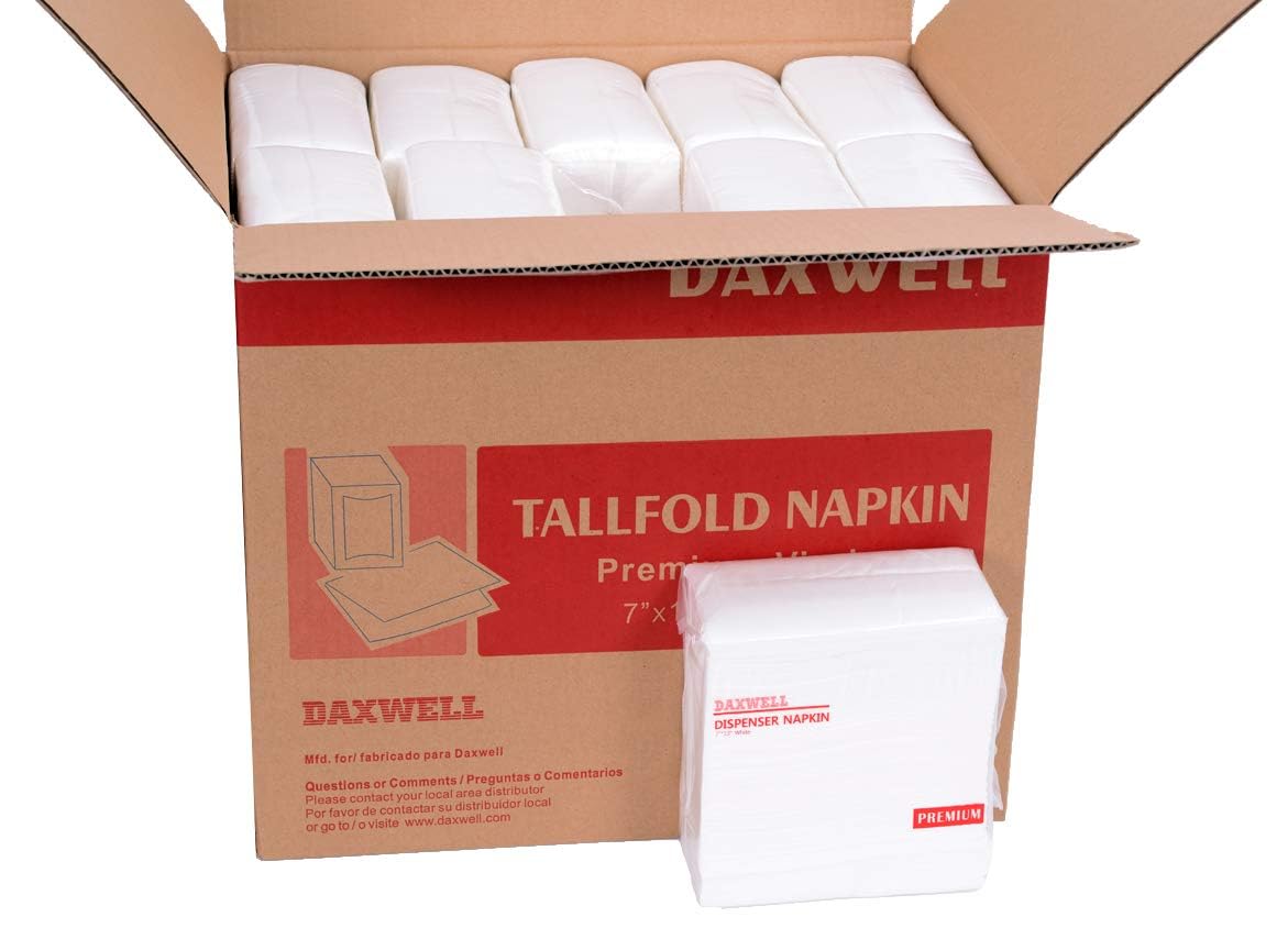 Daxwell tall fold dispenser napkins are ideal for use in restaurants and cafeterias. Perfect blend of quality and value. Compliant with FDA certification. Designed for tall fold dispensers. They measure 13 inches long by 7 inches wide. White color.
