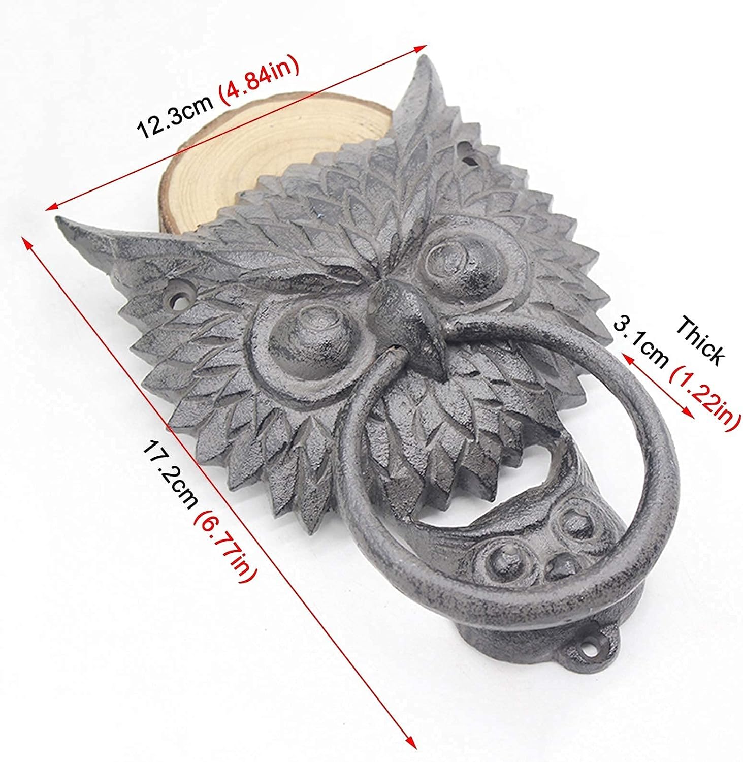 What's better than our door knocker to welcome your cast guests from the original molds,our authentic foundry cast iron is sure to impress with resonant bangs that make big statements on front doors. Features: - Sturdy vintage cast iron - Classic,vintage,owl head design - Suitable for indoor / outdoor / townhouses / neighborhoods / cabinet / wardrobe / apartments / drawers / cabinet / other furniture use - American Modern Rustic Furniture - As a Towel Rack / Cabinet with Open or Unhooked Handle / Hinges for Doors and Windows - Quick and Easy Assembly - Perfect for the small space where you needed to insert it,but large enough to easily grasp the ring and knock - and sturdy too Specifications - Material: Cast iron - Color: Rust color - Size: 12.3 × 3.1 × 17.2 cm (4.84 × 1.22 × 6.77 in) - Weight: 1.5 kg Package Contents : 1 x door knocker (decorative items shown in product photos are not included) Note: - There may be 1-3cm error due to manual measurement t. - There may be chromatic aberration due to the difference between the recording lamp and the display.Please refer to the actual product. We have more styles of door knockers: Door knockers for front door,clapper earrings,peephole clapper,bee clapper,lion clapper,brass clapper,bat clapper,cat clapper,halloween clapper,black clapper,pineapple clapper,bumblebee clapper,skull door clapper... If you need other styles of door knockers,you can browse our store at will.