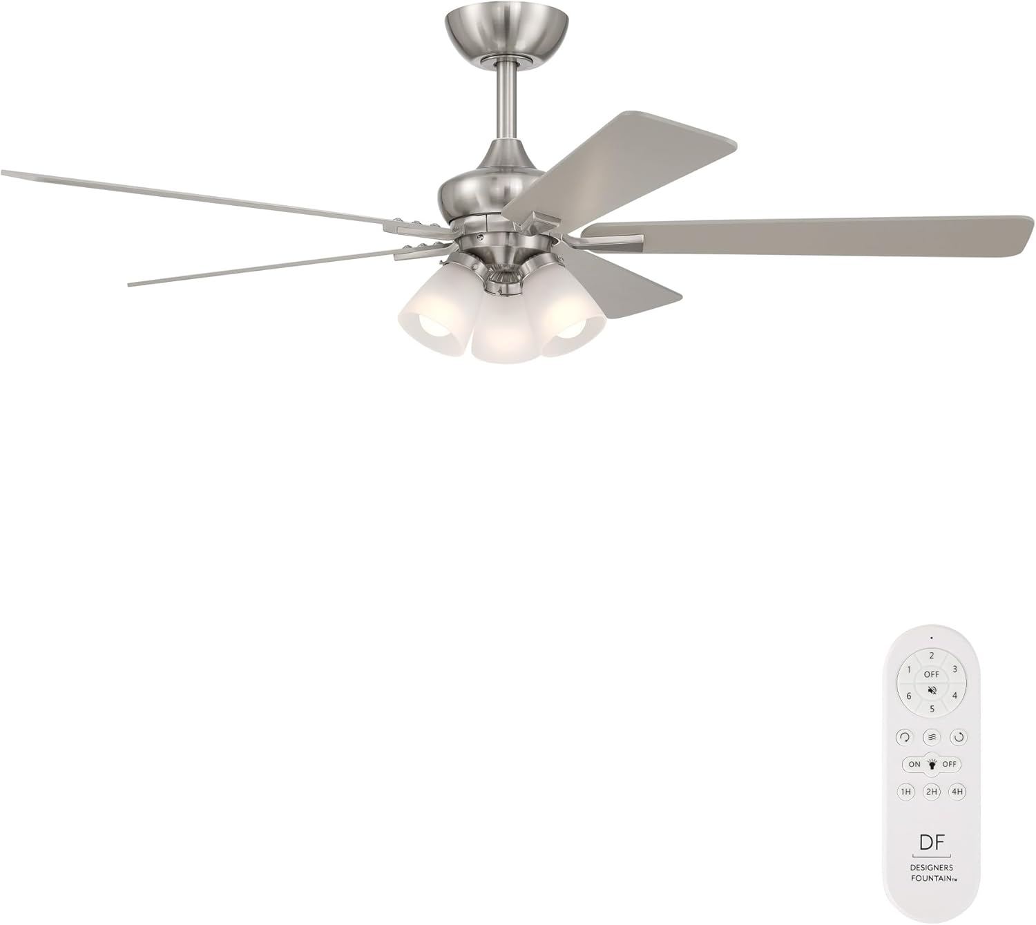 Designers Fountain Charney is a 52 inch indoor ceiling fan with light that pairs a classic traditional design with glass shades for a timeless look across multiple finishes. An energy efficient 6 plus speed DC motor delivers strong airflow up to 4566 CFM for comfortable circulation in large rooms up to 400 sq ft, and reverse airflow supports year round comfort. The included remote control makes it easy to adjust fan speeds, turn the light on or off, and dim the light. Bright, efficient lighting comes from 3 included E26 base LED bulbs that produce 600 lumens each at a steady 3000K soft white with 90 plus CRI for natural color accuracy. The fan is sloped ceiling compatible up to 11 degrees and installs with a downrod mount using the included 6 inch downrod, making it a versatile choice for bedrooms, living rooms, dining rooms, and other dry indoor spaces.