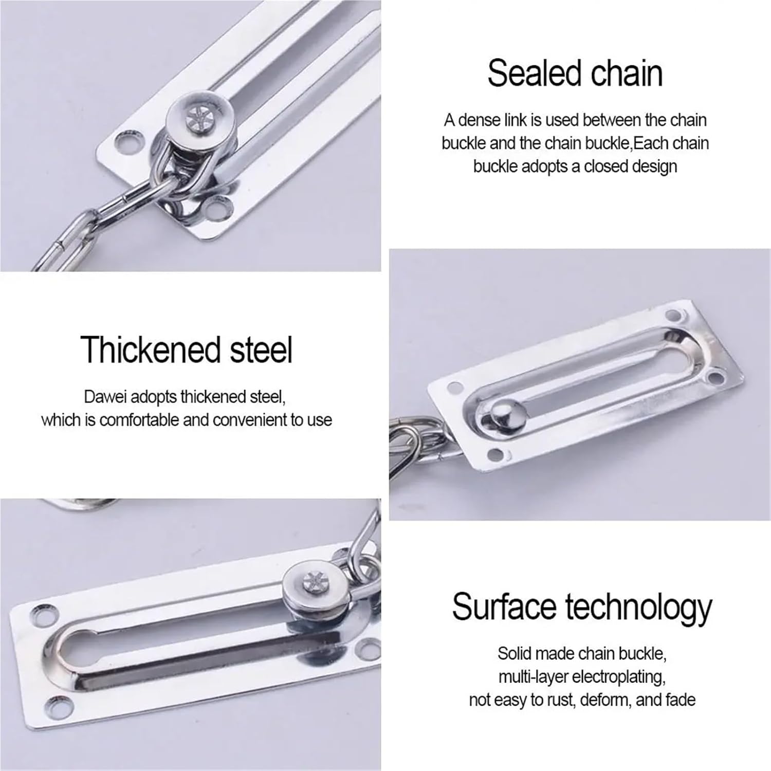 Easy & Quick Installation:Comes with all necessary installation hardware and extended fasteners. The installation process only requires simple steps such as measuring, marking, and drilling, taking just a few minutes to complete, no professional skills neededMaterial: Stainless steelSize: Chain length 18.5cmColor: SilverPackage Lisitng: 10piece