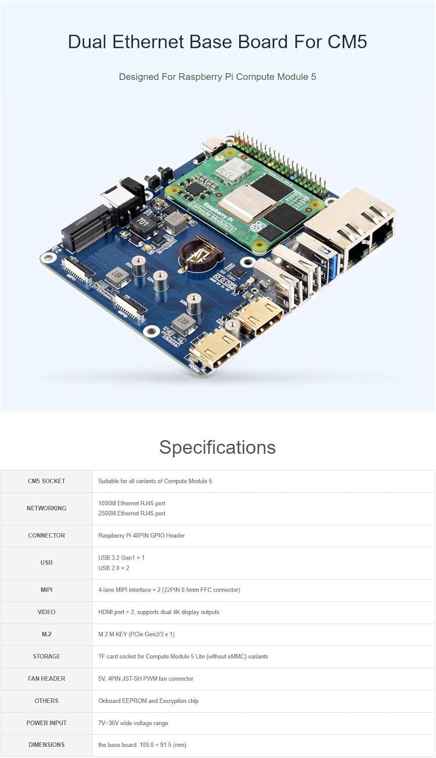 Overview The CM5-DUAL-ETH-BASE is a high-performance baseboard designed for Raspberry Pi Compute Module 5 (CM5), engineered for developers building advanced networking, display, or storage-heavy applications. With dual RJ45 Ethernet ports (2.5G + 1G), this base board delivers blazing-fast network throughput—perfect for building a Pi-based router, firewall, NAS, or industrial gateway. Whether you're working on edge computing or multi-port communications, this setup provides both speed and flexibility. The board also supports dual 4K HDMI display outputs and dual MIPI interfaces, making it ideal for media processing, video wall displays, or dual-camera machine vision systems. Thanks to the M.2 NVMe SSD slot, users can enjoy dramatically improved performance for file I/O and operating system responsiveness. Unlike the traditional microSD card used in Rasp-berry Pi, NVMe allows Compute Module 5 to boot directly from SSD, ensuring enterprise-grade storage reliability and speed. Designed specifically for Compute Module 5 Lite and eMMC variants, the board features a standard CM5 socket and a color-coded 40PIN GPIO header, retaining full compatibility with standard Rasp-berry Pi HATs and GPIO accessories. Whether you’re a maker, hardware engineer, or industrial developer, the Dual Ethernet Baseboard for Raspberry Pi CM5 provides everything you need to take your embedded system to the next level — from high-speed networking to multi-display support and NVMe storage expansion. Package include 1. CM5-DUAL-ETH-BASE x1 2. Screws pack x1