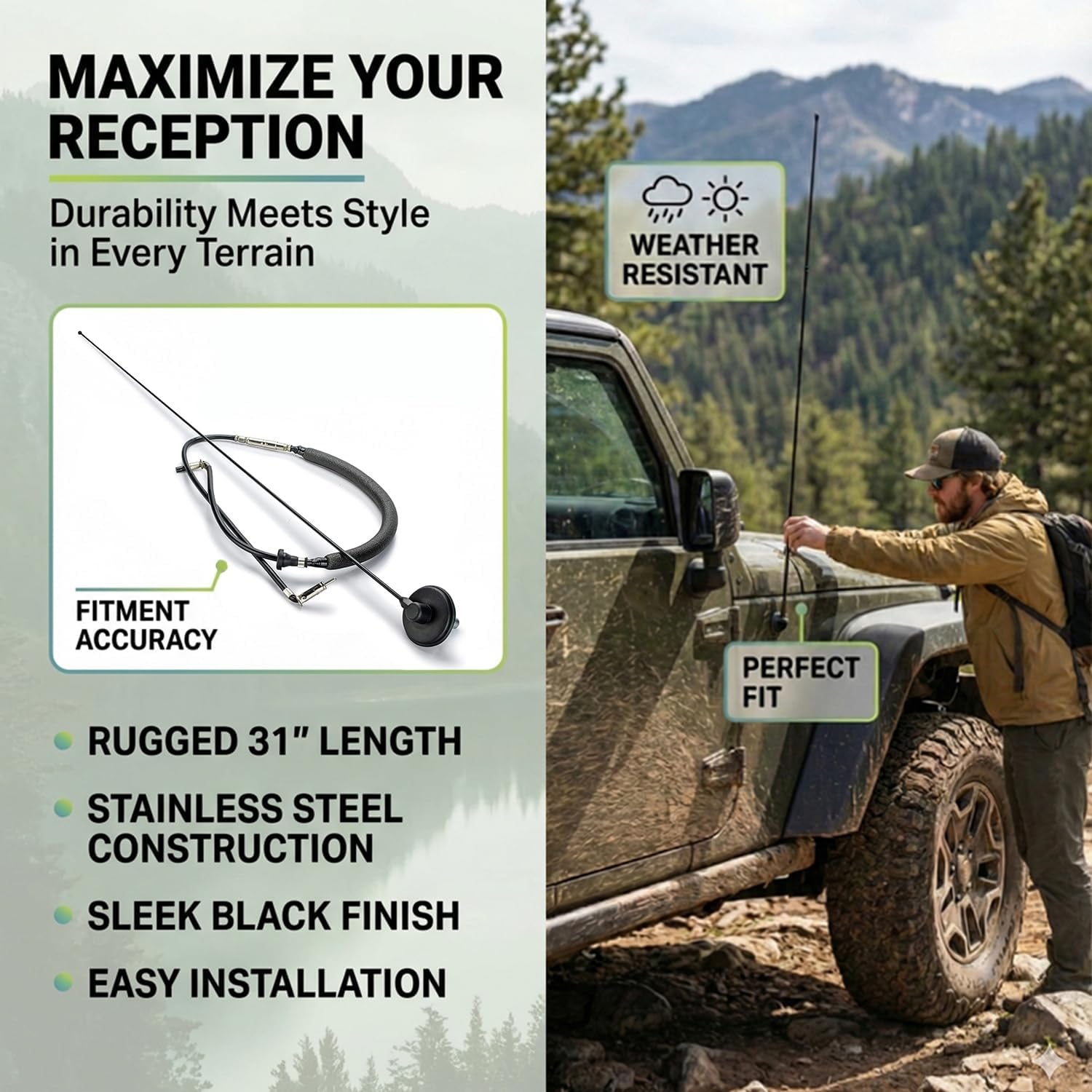 • ๐”๐ง๐ฆ๐š๐ญ๐œ๐ก๐ž๐ ๐š๐ฆ/๐Ÿ๐ฆ ๐‘๐š๐๐ข๐จ ๐€๐ง๐ญ๐ž๐ง๐ง๐š ๐‘๐ž๐œ๐ž๐ฉ๐ญ๐ข๐จ๐ง: Short "stubby" options sacrifice signal for looks, but our 31-inch mast maximizes range. Engineered as a high-performance radio antenna for off-road environments, it captures weak signals miles off the grid so you enjoy static-free music, news, and weather updates wherever the trail takes you
