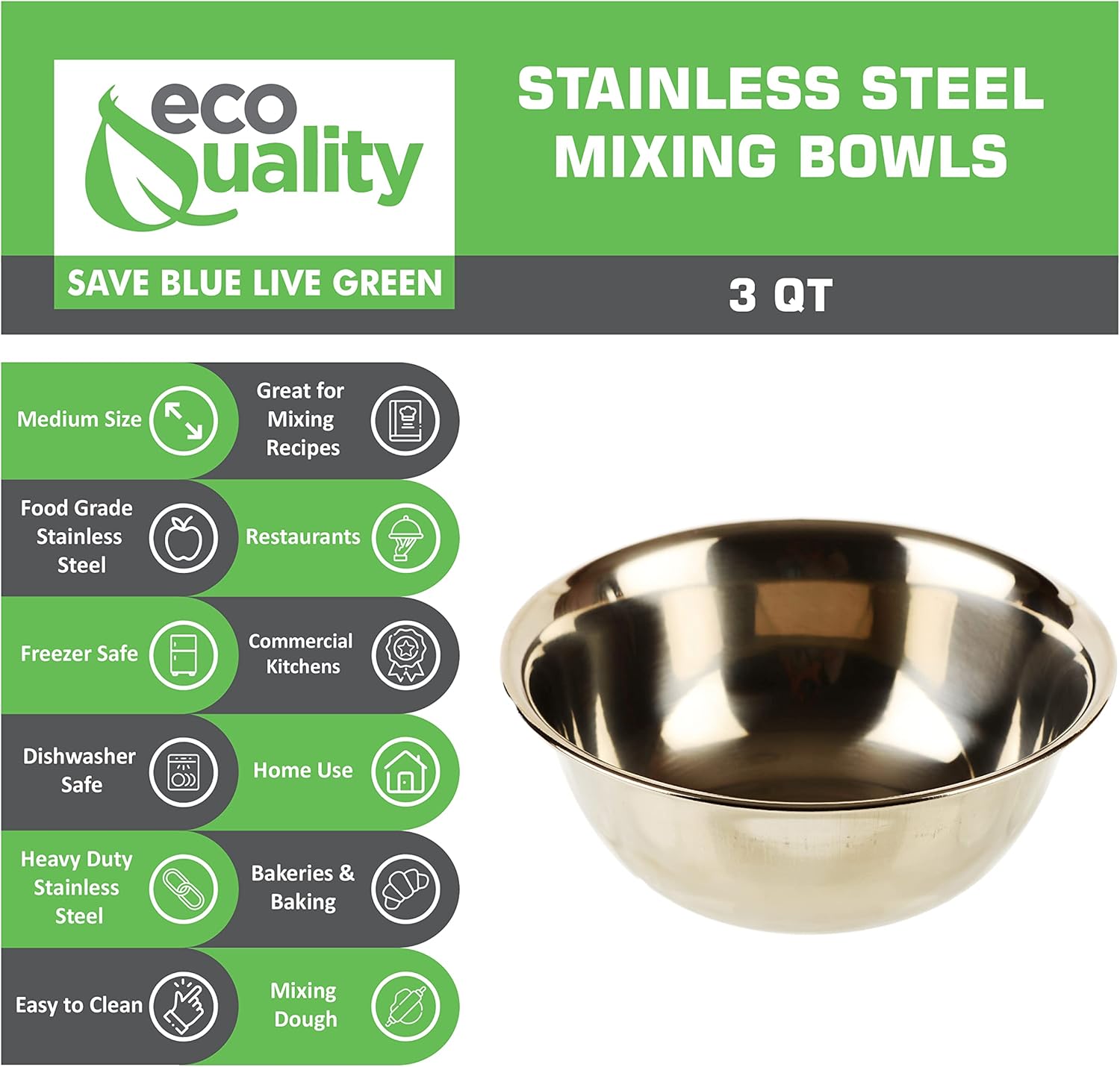EcoQuality 3 Quart Round Stainless Steel Mixing Bowl✔ Medium 3 Qt Capacity✔ Stainless Steel Material Makes for easy cleaning✔ Round Shape makes for easy preparation✔ High Quality Stainless Steel★ Used by many Restaurants, Bakeries and more!★ Round design makes it easy to spin and mix★ Easy to Clean and Easy to Wash!Add to Cart Today!