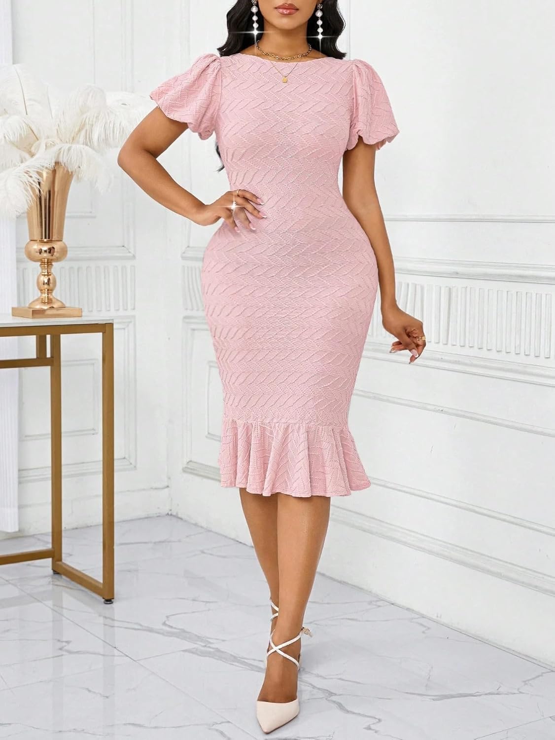 Model is Wearing:S, Height:170.0/66.9 ,Bust:90.0/35.4 ,Waist:65.0/25.6 ,Hip:105.0/41.3 Body Measurements:SHeight:65-66.9 in Bust:33.9-35.4 in Waist Size:26-27.6 in Hip Size:35.8-37.4 inMHeight:65-66.9 in Bust:35.4-37 in Waist Size:27.6-29.1 in Hip Size:37.4-39 inLHeight:66.9-68.9 in Bust:37-39.4 in Waist Size:29.1-31.5 in Hip Size:39-41.3 inXLHeight:66.9-68.9 in Bust:39.4-41.7 in Waist Size:31.5-33.9 in Hip Size:41.3-43.7 inProduct Measurements:SShoulder : 13.3 in Bust : 32.7 in Waist Size : 26.8 in Hip Size : 35 in Length : 39.8/42.5 in Sleeve Length : 9.1 in Bicep Length : 13.9 in Cuff : 10.2 inMShoulder : 13.7 in Bust : 34.3 in Waist Size : 28.3 in Hip Size : 36.6 in Length : 40.2/42.9 in Sleeve Length : 9.3 in Bicep Length : 14.5 in Cuff : 10.8 inLShoulder : 14.1 in Bust : 36.6 in Waist Size : 30.7 in Hip Size : 39 in Length : 40.7/43.5 in Sleeve Length : 9.6 in Bicep Length : 15.4 in Cuff : 11.7 inXLShoulder : 14.5 in Bust : 39 in Waist Size : 33.1 in Hip Size : 41.3 in Length : 41.3/44.1 in Sleeve Length : 10 in Bicep Length : 16.2 in Cuff : 12.5 inWaist Line:Natural(Mid Waist)Sleeve Length:Short SleeveStyle:ElegantNeckline:Round NeckPattern Type:PlainBody:UnlinedSleeve Type:Puff SleeveComposition:96% Polyester, 4% ElastaneCare Instructions:Machine wash or professional dry cleanMaterial:Knitted FabricDetails:Backless, Ruffle, Ruffle HemColor:PinkOccasion:Formal??&?EveningHem Shaped:Sheer:NoFabric Elasticity:Medium StretchLined For Added Warmth:NoLength:MidiFit Type:Slimming FitType:Bodycon