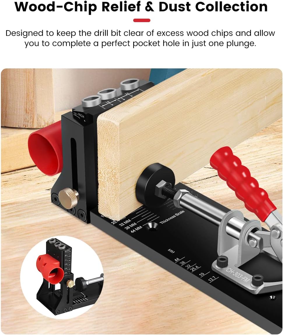 Description:ENJOYWOOD XK4 Pocket Hole Jig Kit Aluminum Alloy Adjustable Woodworking Drilling Guide for Angled Holes with Drill BitSpecification:Material: Aluminum alloyPocket hole diameter: 3/8"Clamping range: 12-42mmType: A: XK4Feature:3-hole Design - Can be used for larger and longer boards providing you flexibility outside the normal limits of most pocket hole jigs.Precise Guide Design - Allow you to make perfectly placed pocket holes without burrs.Adjustable Height - There are two clear scales engraved on the hardening dowel drill joinery kit: inches and millimeters, it will keep clear and won't be worn out like spray painting even if after long-term use . Adjustable drill hole jig pocket using a detachable slider design, it is more convenient to adjust the height according to the thickness of the board.Sturdy Toggle Clamp - Clamping thickness 12-42mm, Offer incredible rigidity and uncompromising workpiece hold-strength.High Duty Aluminum Body - Ensure a reliable woodworking support base.Wood-Chip Relief & Dust Collection - Designed to keep the drill bit clear of excess wood chips and allow you to complete a perfect pocket hole in just one plunge.Removable Drill Guide - Drill guide is removable for use with benchtop and portable bases.Wide Application - Suitable for the connection of various furniture components, it can be used for DIY, making new furniture, refurbishing or repairing old furniture.Package Includes:Accessory name: A: XK4Pocket Hole Jig: 1pcsPortable Base: 1pcs9.5mm (3/8") Drill Bit: 1pcsSQ2 Screwdriver Bit: 1pcsStop Collar: 1pcsPocket Hole Screws(1"/1.25"/1.5"/2"): 40pcs