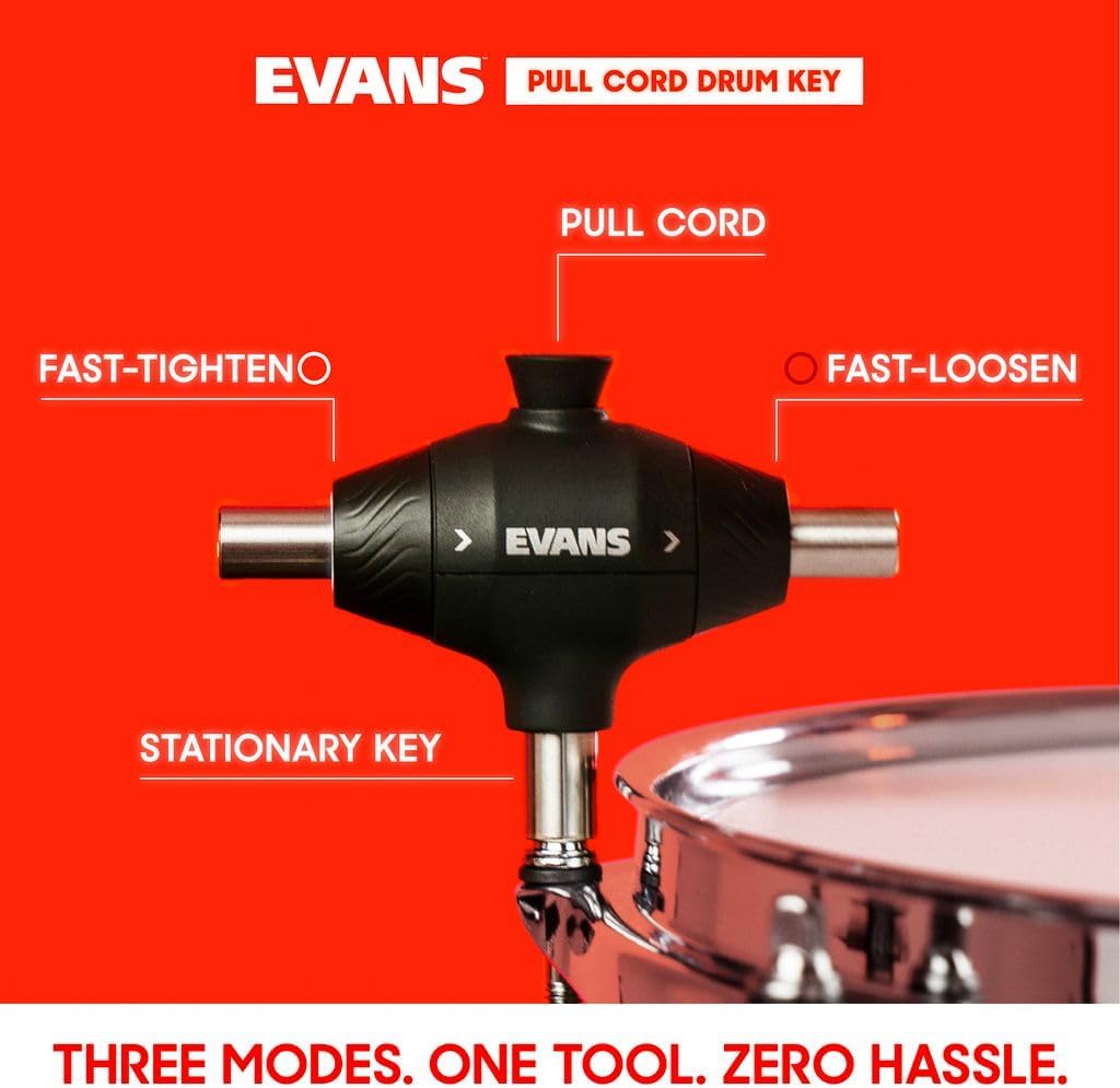 Evans Pull Cord Drum Key gives you the speed of a power drill, with the freedom of a drum key. The two horizontal key heads are connected to a retractable pull cord pulley system that lets you rapidly fasten or loosen the tension rods without a drill. The third, fixed key head is for fine tuning. Designed with a sleek, durable plastic housing and rated for hundreds of drumhead changes, Evans Pull Cord Drum Key is the most efficient way to change or tune your heads.