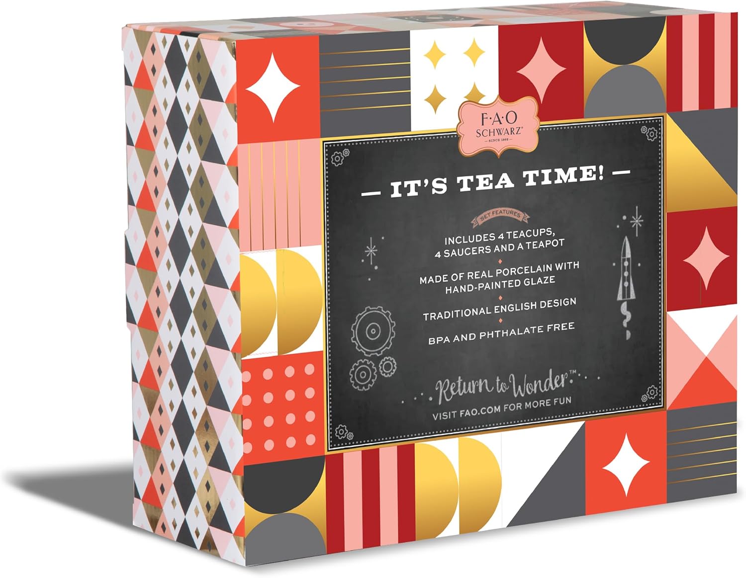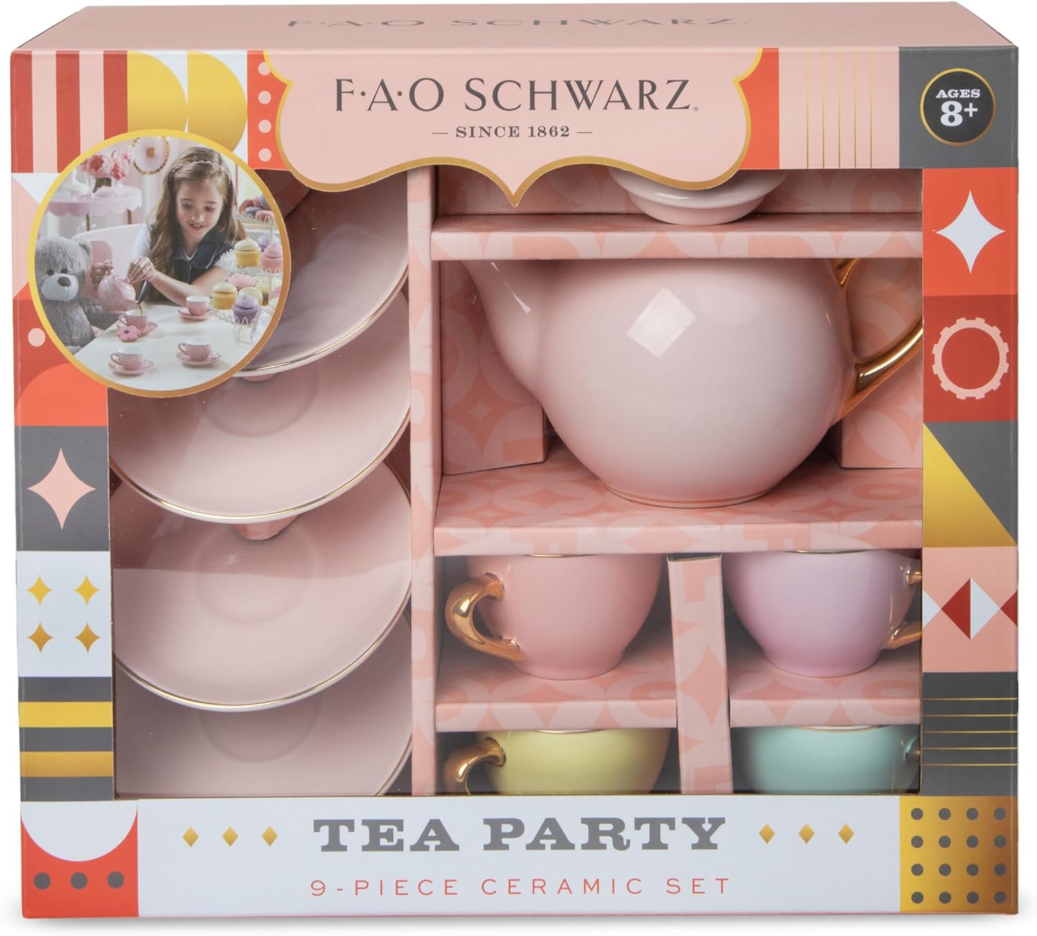 Invite your friends, family, and teddy bears to your very own afternoon tea party! Accommodating up to four participants, the FAO Schwarz 9-Piece Ceramic Tea Party Set includes all the tea ware you need to get started. The toy tea set includes enough miniature place settings for four, with four saucers, four tea cups, and a teapot with lid. All pieces in this set are fully functional, so serve tea or your favorite beverage! All pieces in the ceramic tea party set are BPA and phthalate free, so use safely with real food and drink! All pieces are hand-wash only; do not place in dishwasher, and do not microwave.