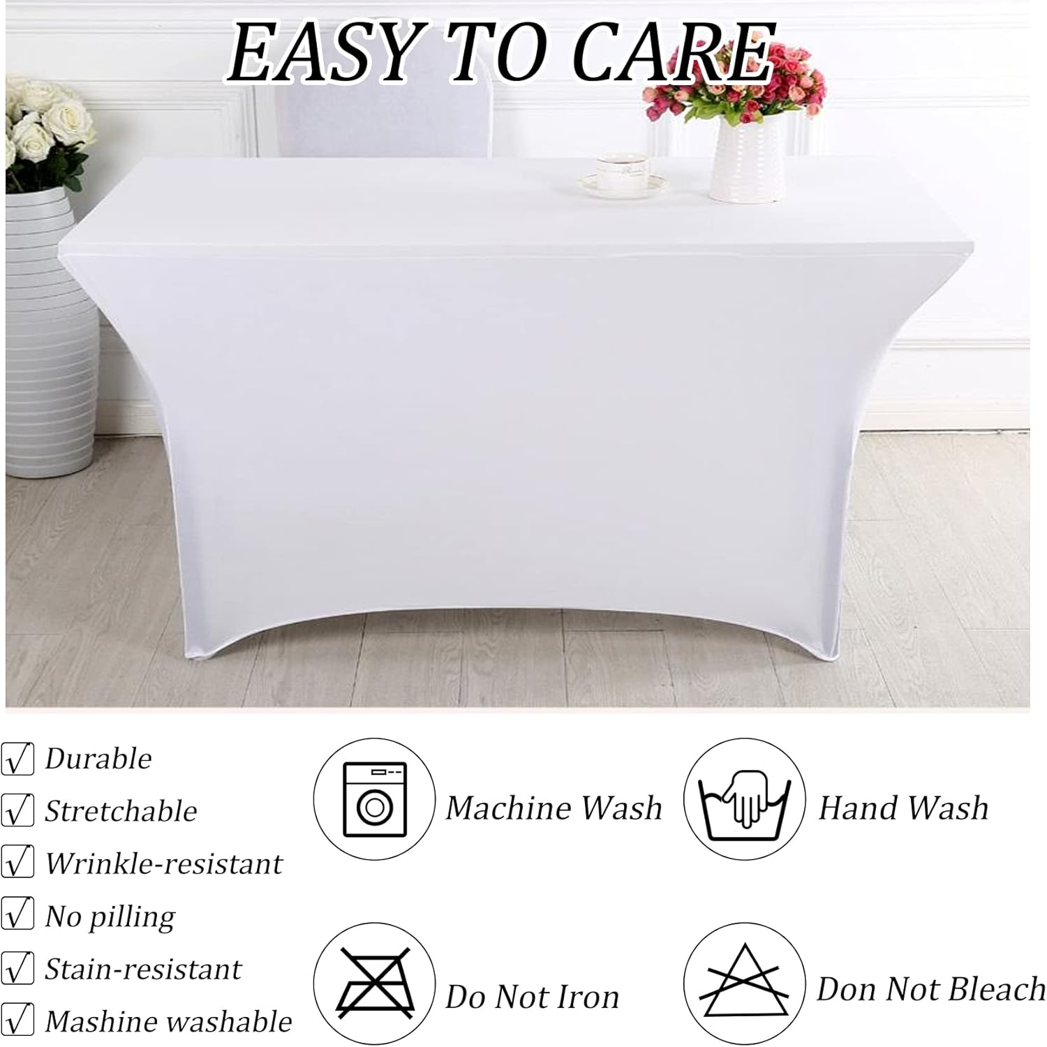 6FT Spandex Table Cover Table Cloth for Folding Tables Fitted Rectangular Tablecover Washable Wrinkle Resistant Polyester Stretch White Tablecloth Protector for Wedding Banquet Party (4 Pack, White) Rectangular Spandex Table Cover Features: 1. The spandex and polyester fabric is wrinkle resistant, stain resistant and smooth, stretches tightly with a sleek design. It can be reuse for many times. 2. The spandex table cover is designed with 4 reinforced elastic foot pockets which hold the table cover securely in place. 3. Thick and durable fabric, will not be so thin as to see the legs of the table inside. 4. Take this lightweight and durable polyester tablecloth anywhere, and handle it with ease for all your events and needs with class. 5. You do not even need to iron it before or after using it.When you finish, just fold it and store it in a storage bag. Specifications: Item Name: Rectangular Spandex Table Cover Material: 10% Spandex, 90% Polyester Size: 6Ft Color: White Quantity: 4 Pieces How to Choose the Table Cover Size? 4FT:Suitable for 48"L x 24" W x 30" H(122CMX61CMX76CM)table 6FT:Suitable for 72''L x 30''W x 30''H(183CM x 76CM x 76CM)table 8FT:Suitable for 96"L X 30"W X 30"H(244CMX76CMX76CM)table Wash Instruction: Machine washable with water (cold or room temperature) in gentle cycle. Use normal detergent. Bleach is not recommended. Don't wash with other materials or clothing. Tumble dry with low temperature. does not require ironing and can be laundered countless times. Warm notice: 1. Please allow slight error on size due to manual measurement. 2. Please allow slight chromatic aberration due to different screens and lights.