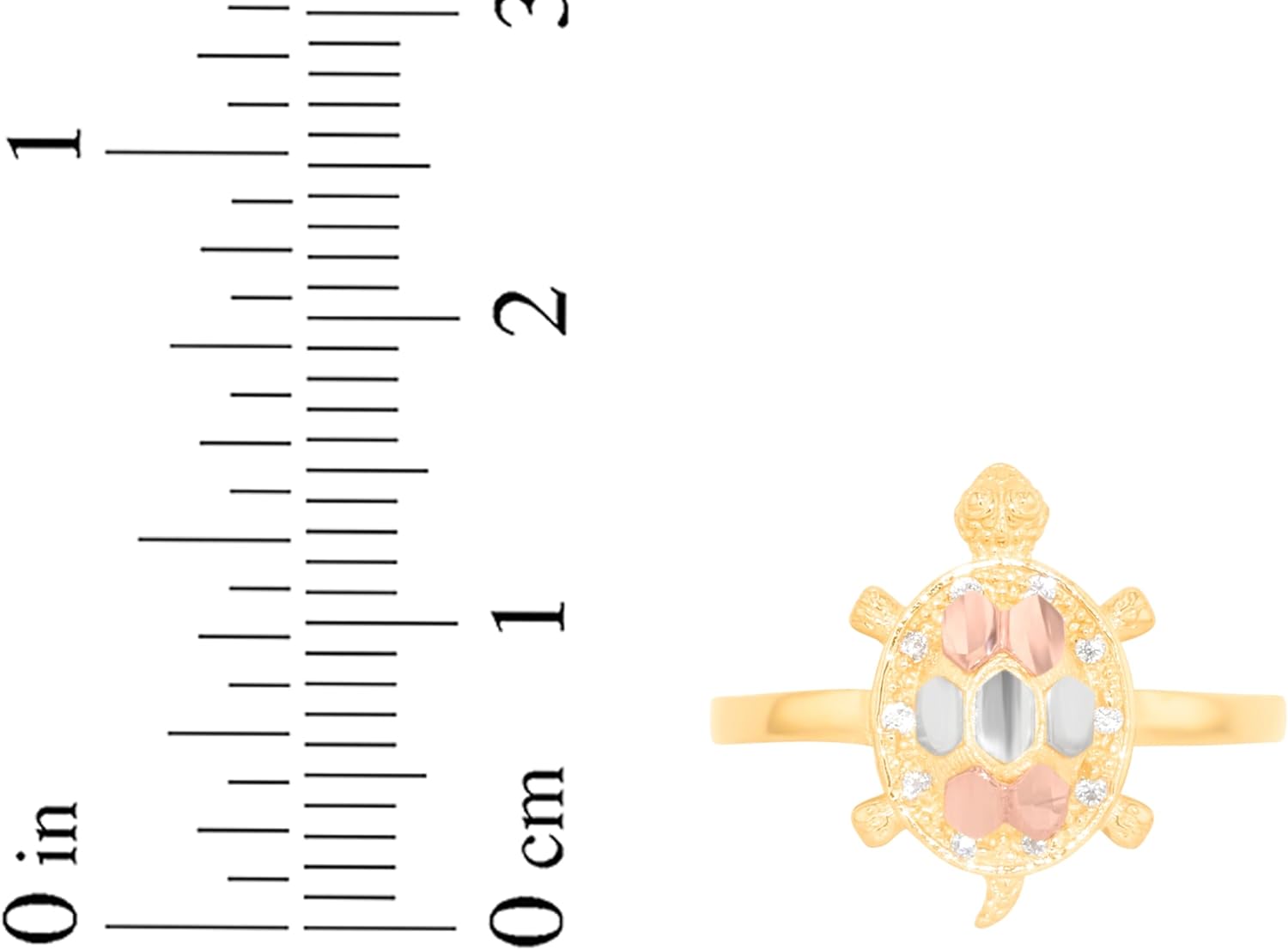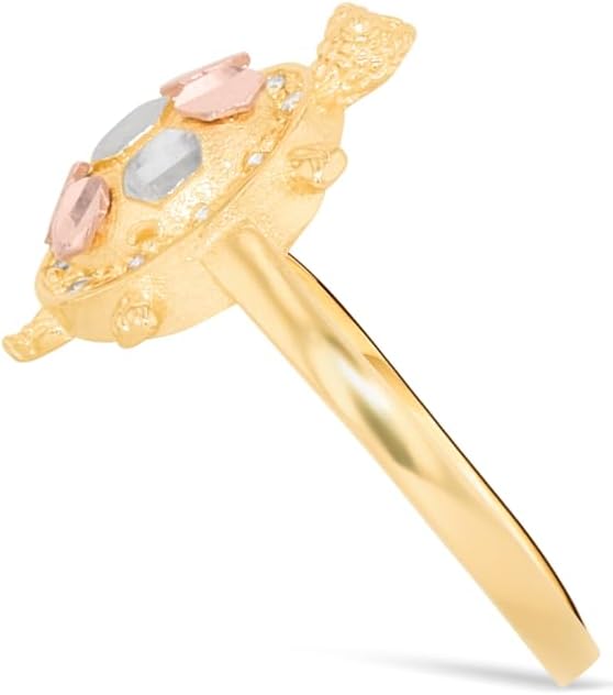 Jewelry Type — RingStyle— CZ Turtle Tri-ToneMetal Type — GoldMetal Color — Yellow GoldGold Karat — 10kSolid/Hollow — SolidHeight — 15.1 millimetersVariations — Sizes 4 to 9.5Weight — 2.2 grams