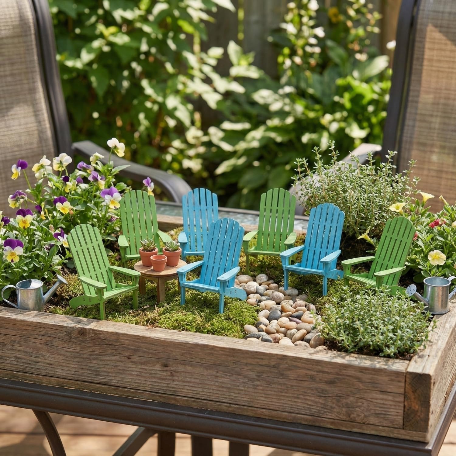 | Included Components | 12 Mini Blue and Green Wooden Adirondak Chairs |