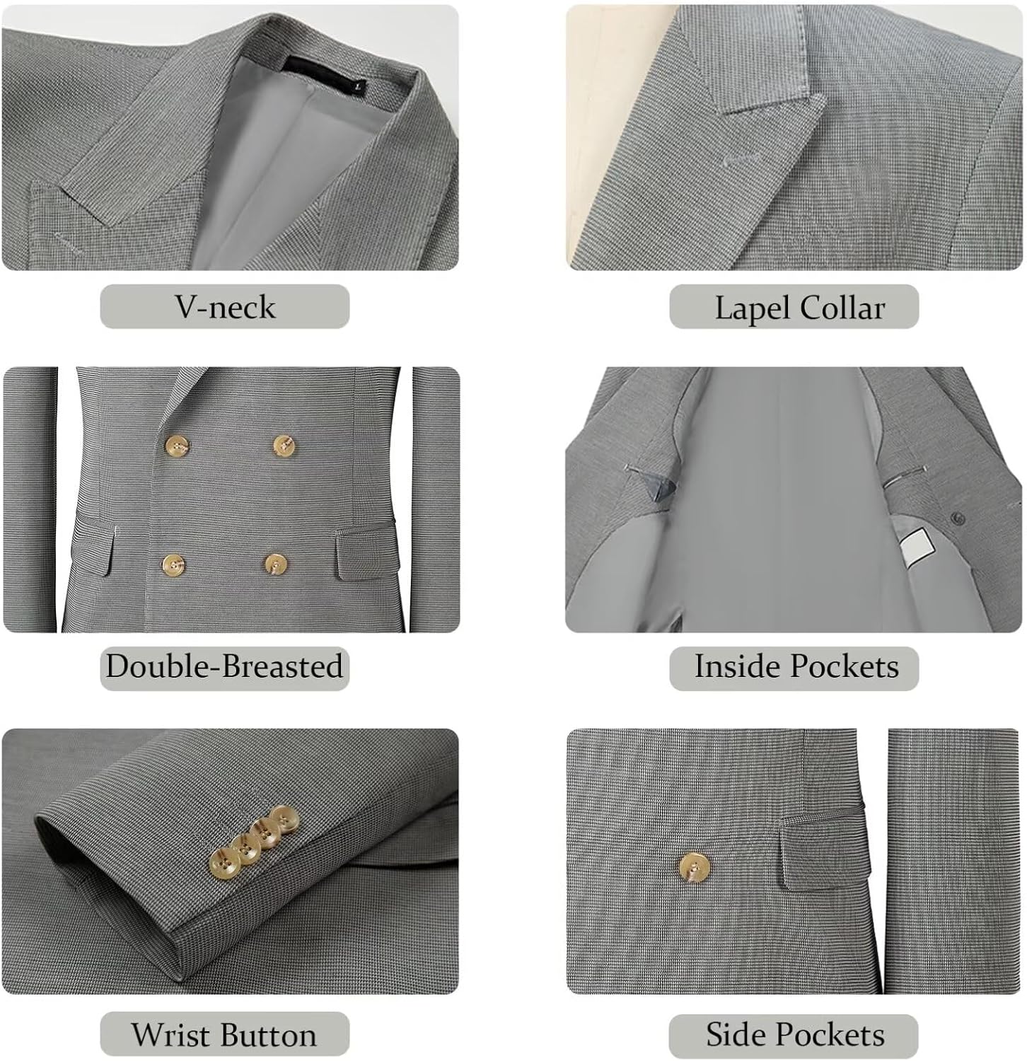 Brand:FxzpiodiFabric:Terylene70%rayon30%Fit:Slim fitElasticity:No elasticityThickness:ModerateColor:Grey(More Colors).Size:X-Small,Small,Medium,Large,X-large,XX-Large,XXX-Large.Suit Jacket:Solid/Double-Breasted/Lapel collar/one chest pocket /two flap pockets/two inner pockets/side vents.Occasion:The men suit jacket is a classic style in men's wardrobe, ideal for business,dances, banquets, weddings,magic shows, music bands,Halloween, Christmas Eve,prom, party, disco, nightclub,dinner, graduation, ceremony, dating, meeting, stage performance, festival, new year, This suit jacket is suit for your Father,Brother,Boyfriend or Friends.Care instruction:Dry clean recommended If Conditions Permit,If you have to hand wash the suit tuxedo for men,Please Keep the Water Temperature Below 40 Degrees and Wash Gently.Steam ironing, hang the suit on the hangers when you are not wearing them. Not machine washable.The tuxedo featured with Polyester fabric, exquisite embroidered gives you more noble disposition.double-breasted two button closure, Lapel collar perfectly present your gentility.A fit tuxedo jackets show your styles and can suit many occasions, is both fashionable and versatile.Simply styled, this men's jacket is match for any occasion and can be worn with any accessory.