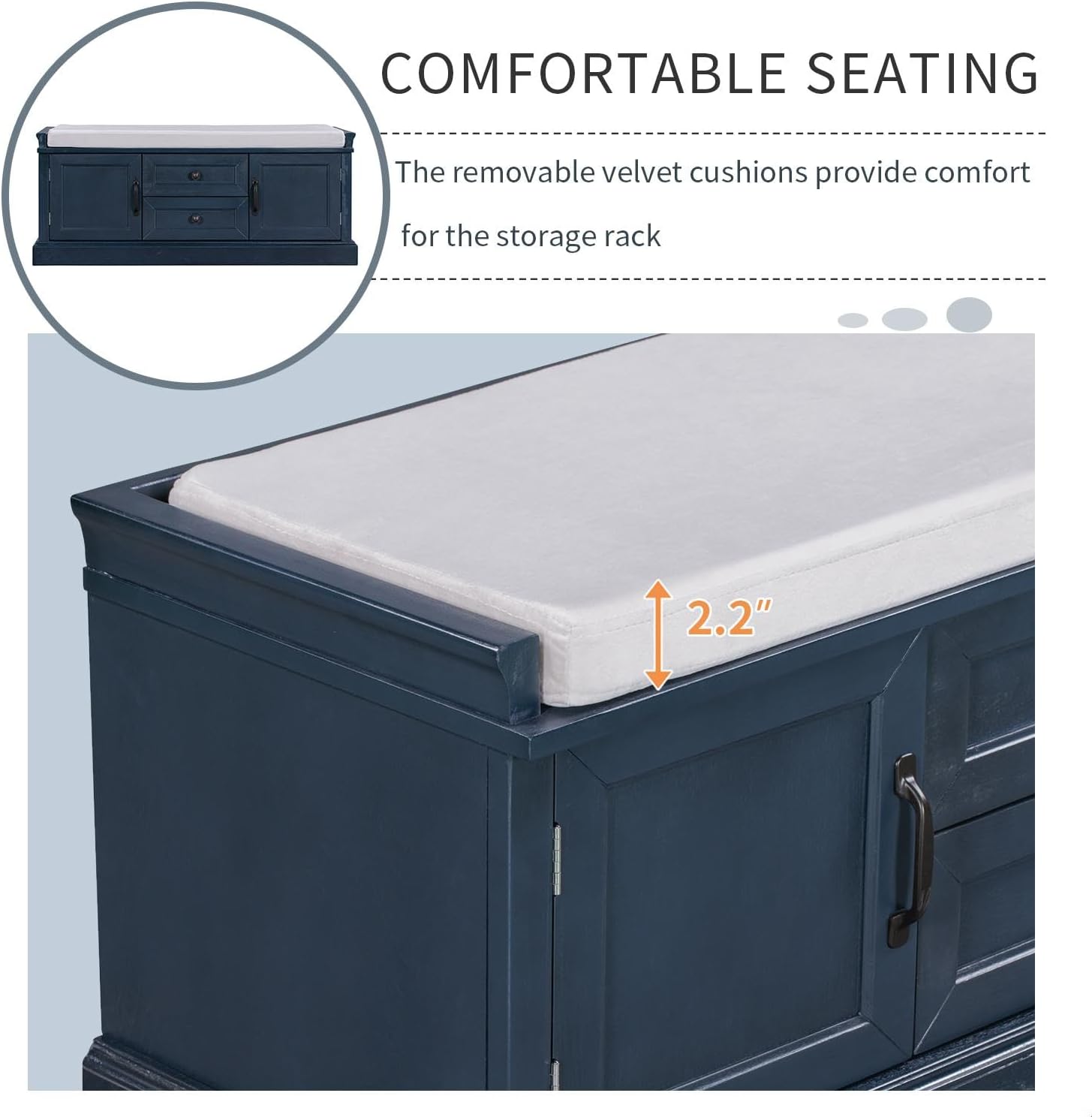 Enhance Your Home with Rustic CharmThe GDFStudio Rustic Storage Bench is a versatile and elegant solution for keeping your entryway, living room, or hallway organized. Combining a classic farmhouse style with modern functionality, this rectangular ottoman features 4 shutter-style doors with retro aluminum handles and adjustable shelves that offer ample storage for shoes, books, and everyday essentials.Key Features:Classic Style: The distressed finish and shutter-style doors with decorative handles create a timeless look that enhances any decor.Quality Construction: Crafted with a solid wood frame and high-quality MDF panels, the bench is designed for durability and stability, with a robust tabletop supporting over 200 lbs.Versatile Storage: Four enclosed doors with adjustable shelves provide flexible storage solutions to keep your space organized and clutter-free.Comfortable Seating: A removable velvet cushion with a 2.2-inch thickness offers soft, cozy seating, perfect for putting on shoes or relaxing.Effortless Assembly: Detailed instructions and all necessary hardware are included, ensuring a quick, hassle-free setup. Overall dimensions: 42.5" L x 15.9" W x 17.5" H; cabinet door dimensions: 12.2" L x 11.6" H; drawer dimensions: 11.8" L x 3.2" H x 11.8" D.Product Specifications:Main Material: Solid Wood + MDFProduct Dimensions: 42.70" L x 15.90" W x 17.40" HProduct Weight: 50.37 lbsWeight Capacity: Over 200 lbs on the tabletopUpgrade your home organization with this stylish and functional storage bench that effortlessly blends rustic charm with modern practicality.