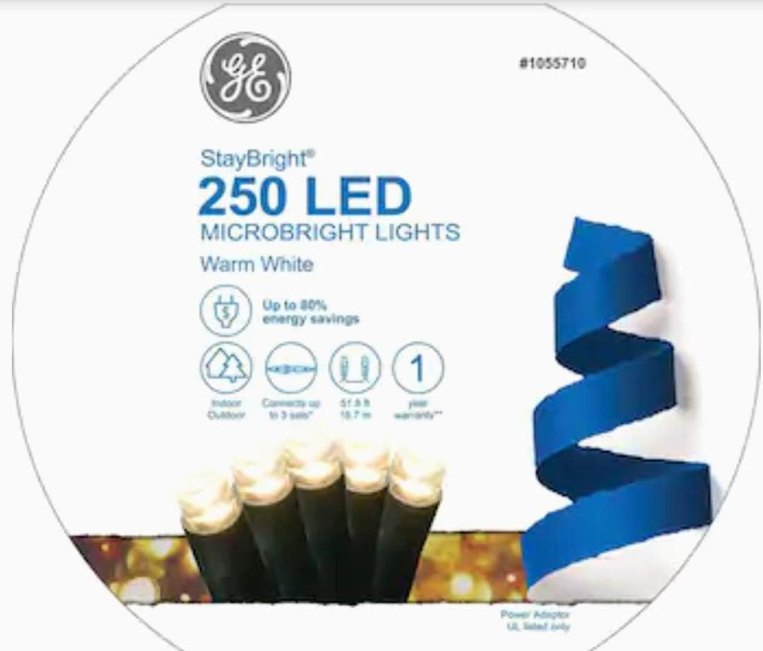 GE StayBright LED MicroBright 250-count warm white light set on storage reel. 36-Inch lead wire, 2.5-inch lamp spacing, 4-inch coaxial end connector, 51.8-feet lighted length, and white cord set. Features: GE LED MicroBright Christmas string lights on a storage reel. 250-Count, warm white LED lights. 51.8-Feet lighted length, white cord. Can connect up to 3 sets. For indoor or outdoor use