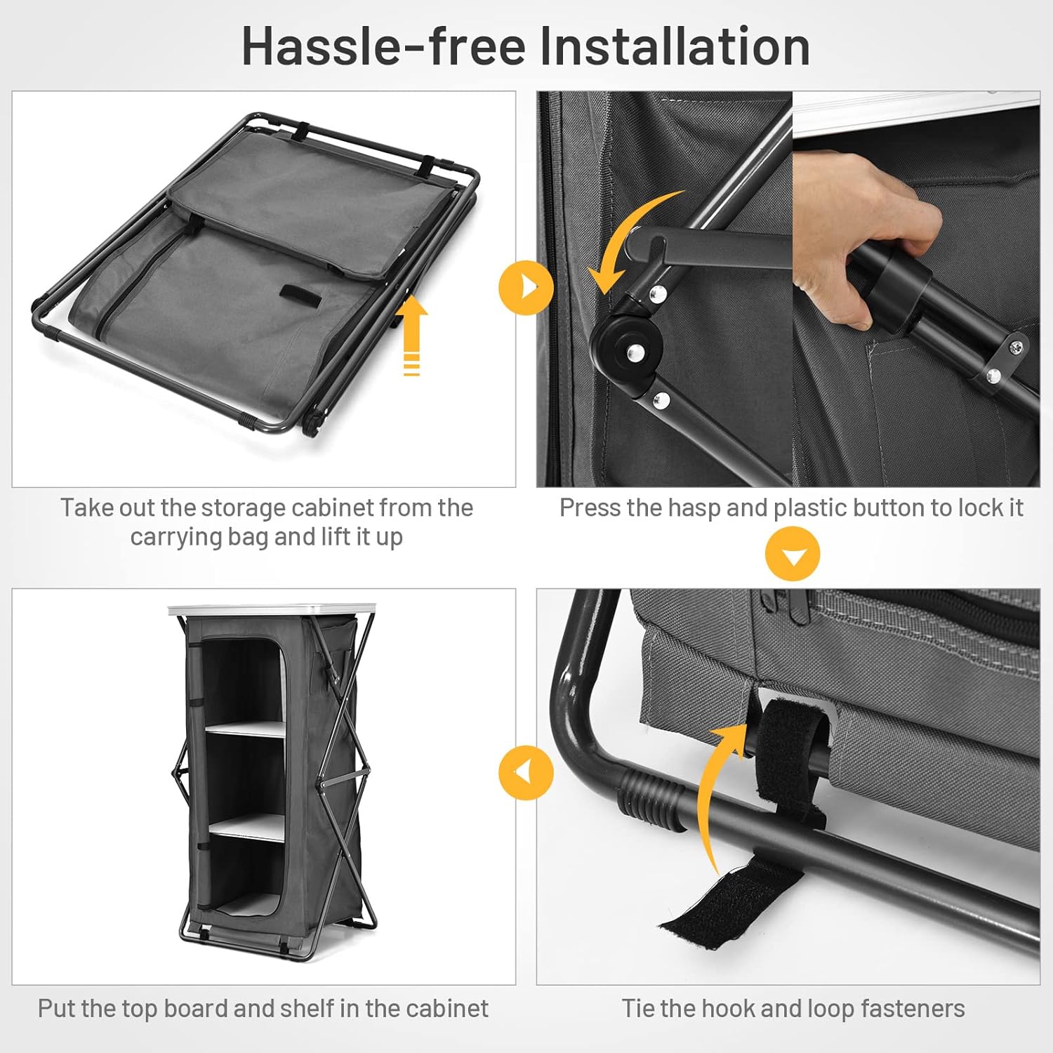 | Assembly Instructions Description | Take out the storage cabinet from the carrying bag and lift it up, then press the hasp and plastic buttons to lock it, tie the hook and loop fasteners, and finally put the top board and shelf in. |