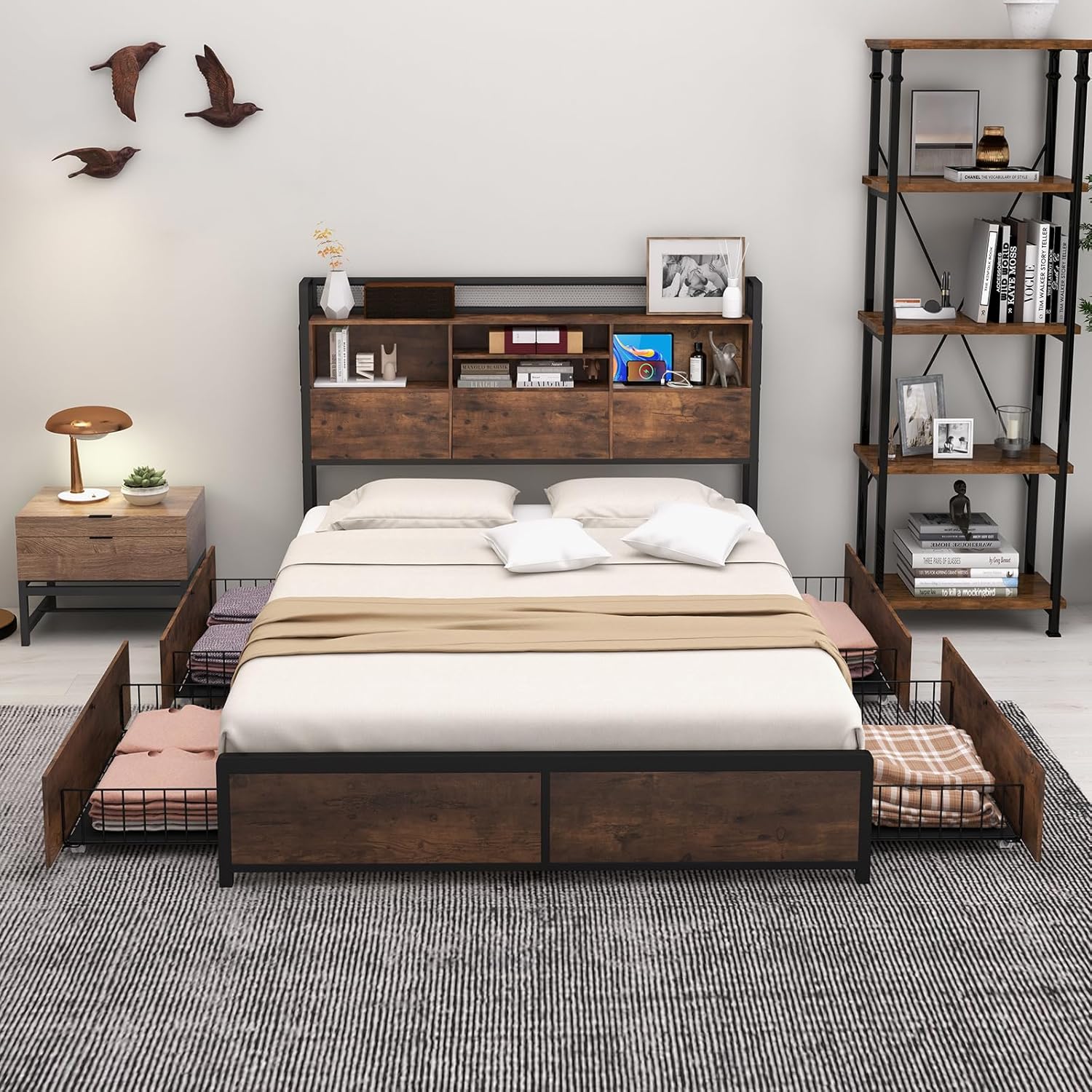 Description: This bed frame is designed to provide a sturdy and comfortable sleep experience while maximizing your bedroom space. Practical 3-tier storage headboard features 1 top open shelf, 4 open compartments, hidden storage space and 2 side pockets to keep your room tidy and organized. More, the intimate power strip provides a convenient and easily accessible charging solution for your devices. More importantly, the platform bed is crafted with a metal slatted frame for solid support and long-term durability. 4 large drawers on casters can roll in and out smoothly, providing ample storage space for clothes, books and off-season bedding. All in all, the industrial bed frame makes up a high-quality and understated appearance. Features: Practical 3-tier storage headboard for bedtime essentials Enjoy the convenience of a charging station right at your bedside FCC certification & ETL certification for higher safety Powder-coated metal slats for strong support Mute bar to prevent noise or friction Non-slip foot pads to prevent scratches 4 drawers with liners to organize your off-season bedding Flexible snap-on design to fix drawers Smooth rolling casters for easy movement Sturdy support legs for higher stability Industrial headboard and footboard fit with interior decor Embedded design firmly secure your mattress Sturdy foundation for your mattress without use of a box spring Customized buckle for easy assembly Specifications: Color: Vintage Brown Material: Metal, MDF Overall Dimension: 83" x 55" x 44" (L x W x H) Dimension of Drawer: 29.5" x 19.5" x 5.5" (L x W x H) Height of Footboard: 12.5" Headboard Width: 7" Under-bed Space: 8.5" Outlet: 125V/12A USB Port: 5V/2A Power Cord Length: 5 FT Recommended Mattress: Full (not included) Recommended Mattress Thickness: 8"-10"(not included) Net Weight: 103.5 lbs Weight Capacity of Bed Frame: 400 lbs Total Weight Capacity of Storage Headboard: 140 lbs Weight Capacity of Each Drawer: 22 lbs Package Includes: 1 x Bed Frame 4 x Drawers 1 x User Guide