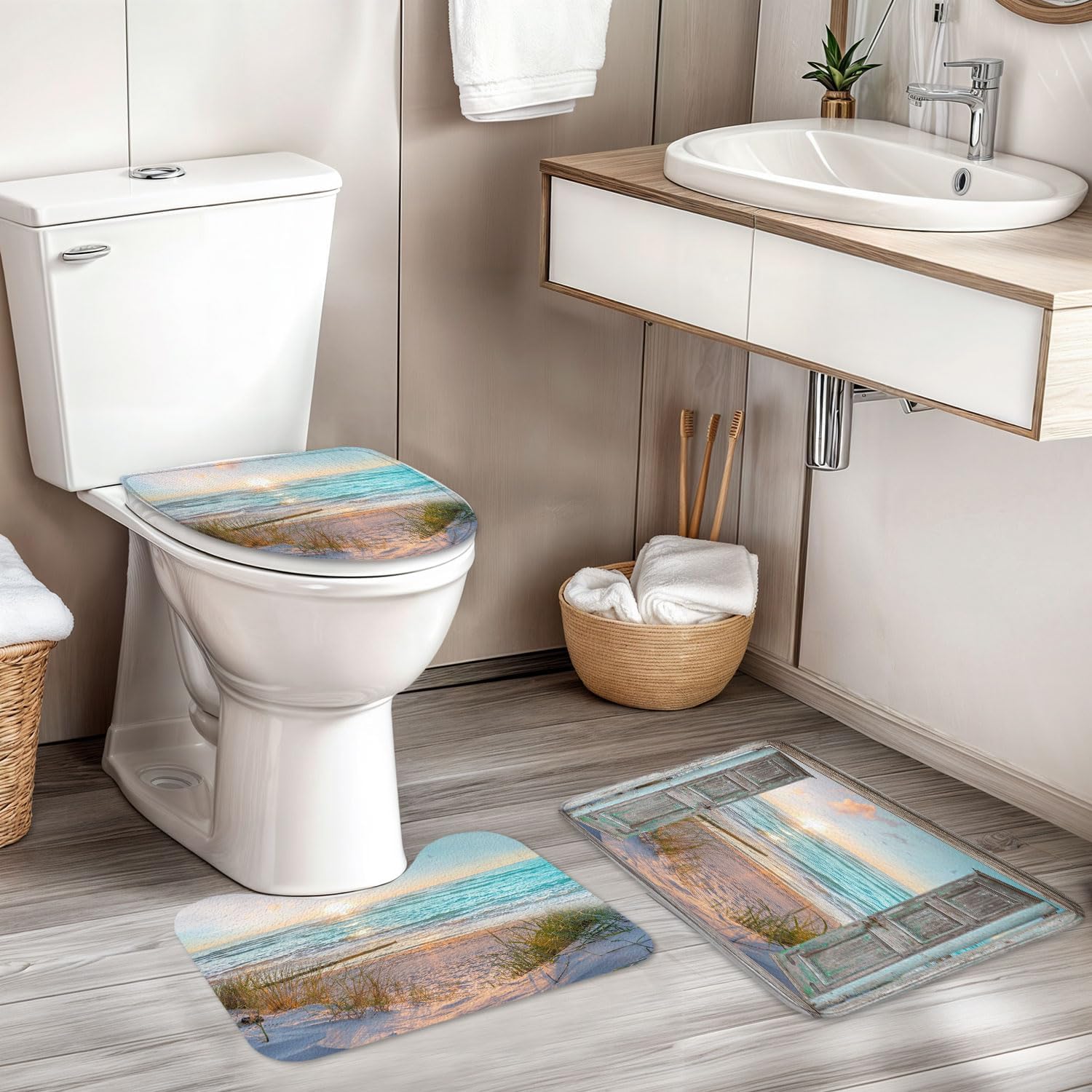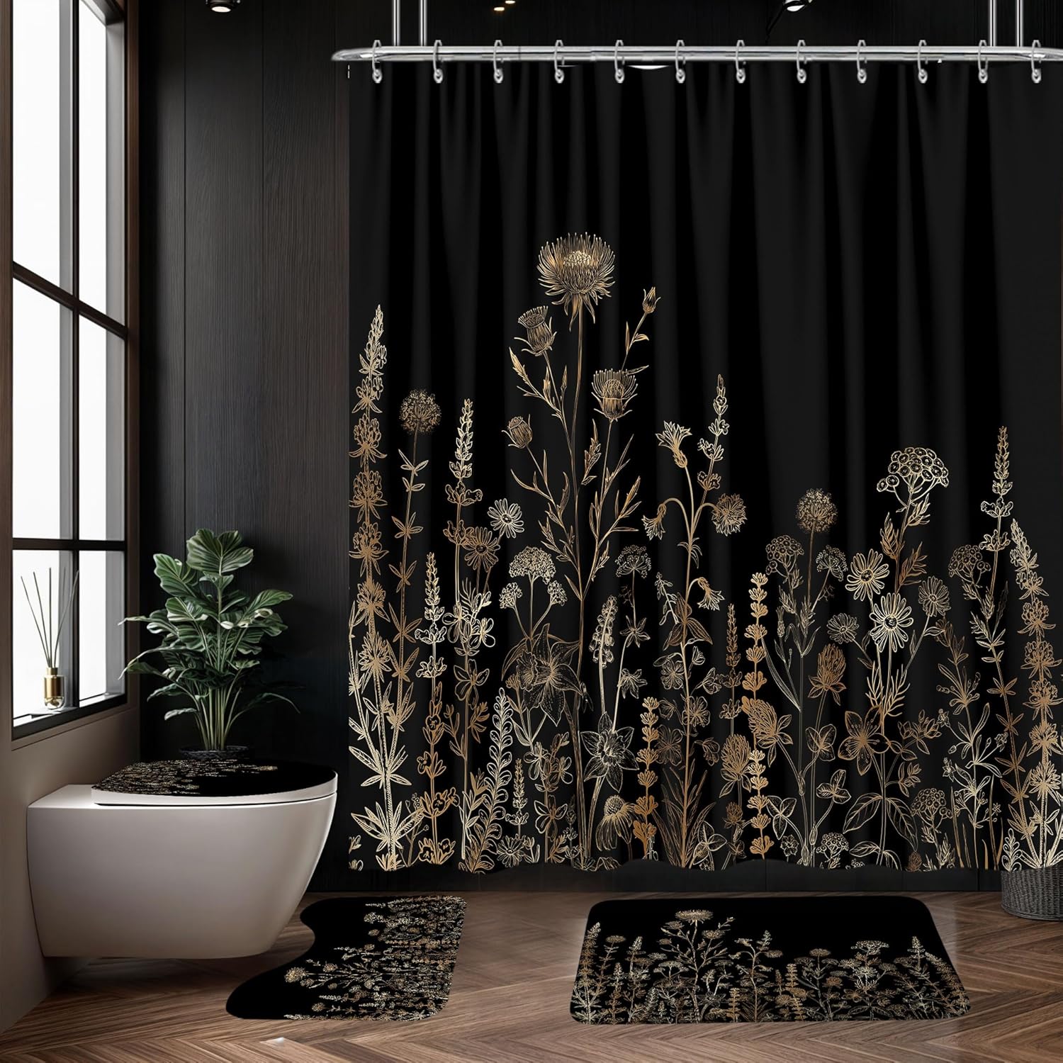 Transform your bathroom with our 4-Piece Shower Curtain Set, featuring a shower curtain, non-slip bath mat, U-shaped rug, and toilet seat cover mat. Designed for style and functionality, this set creates a fresh and inviting bathroom space. Features: Elegant Design: Delicate patterns add sophistication to your bathroom. Waterproof Shower Curtain: Repels water for easy cleaning and durability. Soft & Absorbent Mats: Made from plush flannel for comfort and quick drying. Non-Slip Backing: Ensures safety on wet surfaces. Sizes: Shower Curtain: 72x72 inches,Includes 12 hooks for quick installation. Bath Mat: 17.7x29.5 inches U-Shaped Rug: 15.3x17.7 inches Toilet Lid Cover: 14.9x16.5 inches Tips: Colors may vary slightly due to screen settings. Allow 1-2 cm deviation in size due to manual measurement.