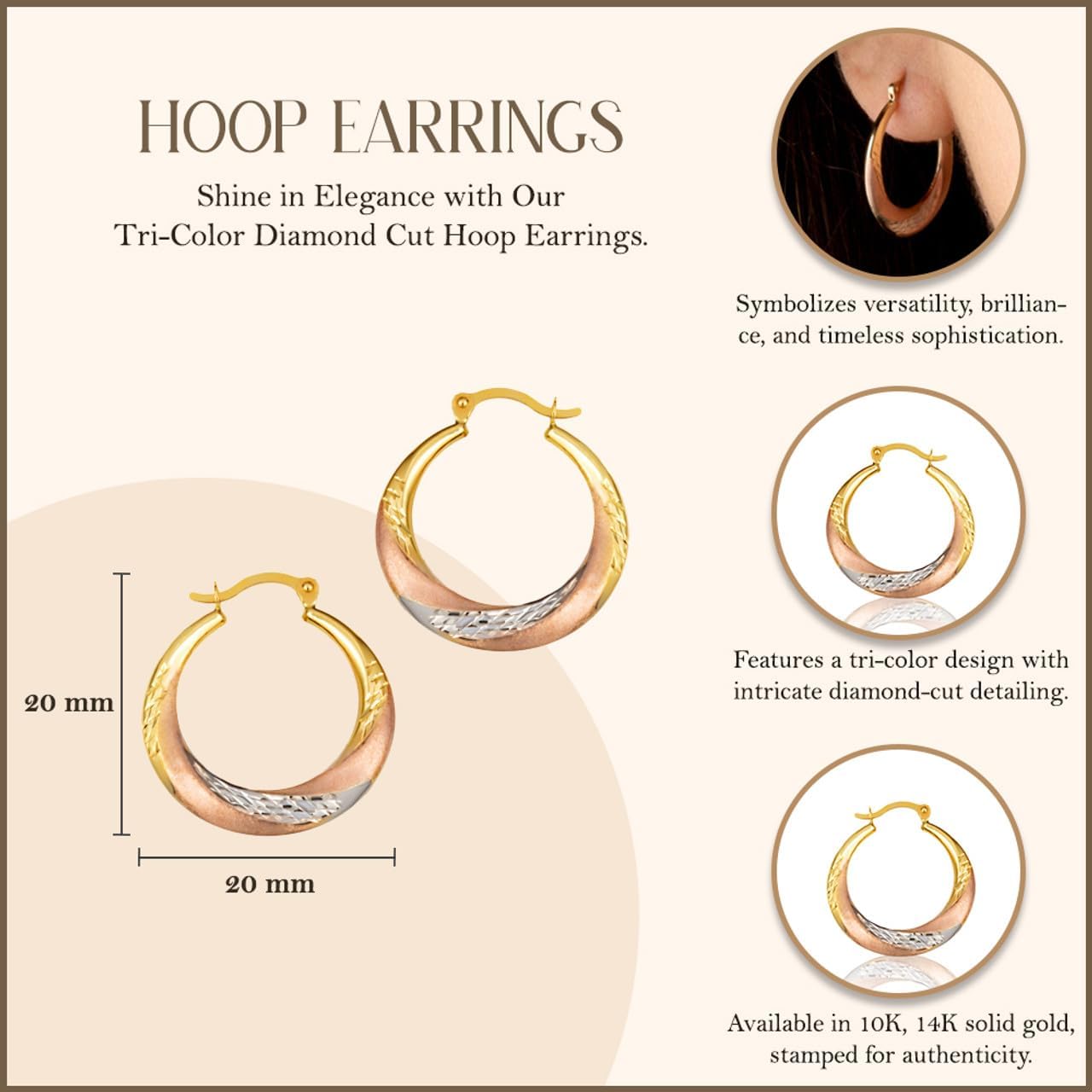The Tri-Color Sparkle Cut Hoop Earrings are a radiant display of elegance and versatility. These hoops feature a tri-color design with intricate sparkle-cut detailing, adding a touch of brilliance and texture that catches the light beautifully. Their timeless style makes them perfect for complementing both casual and formal looks. Ideal for those who appreciate versatile jewelry, these earrings make a thoughtful gift or a chic addition to your collection. The Tri-Color Sparkle Cut Hoop Earrings offer a blend of sophistication and charm, ensuring they remain a favorite for any occasion.