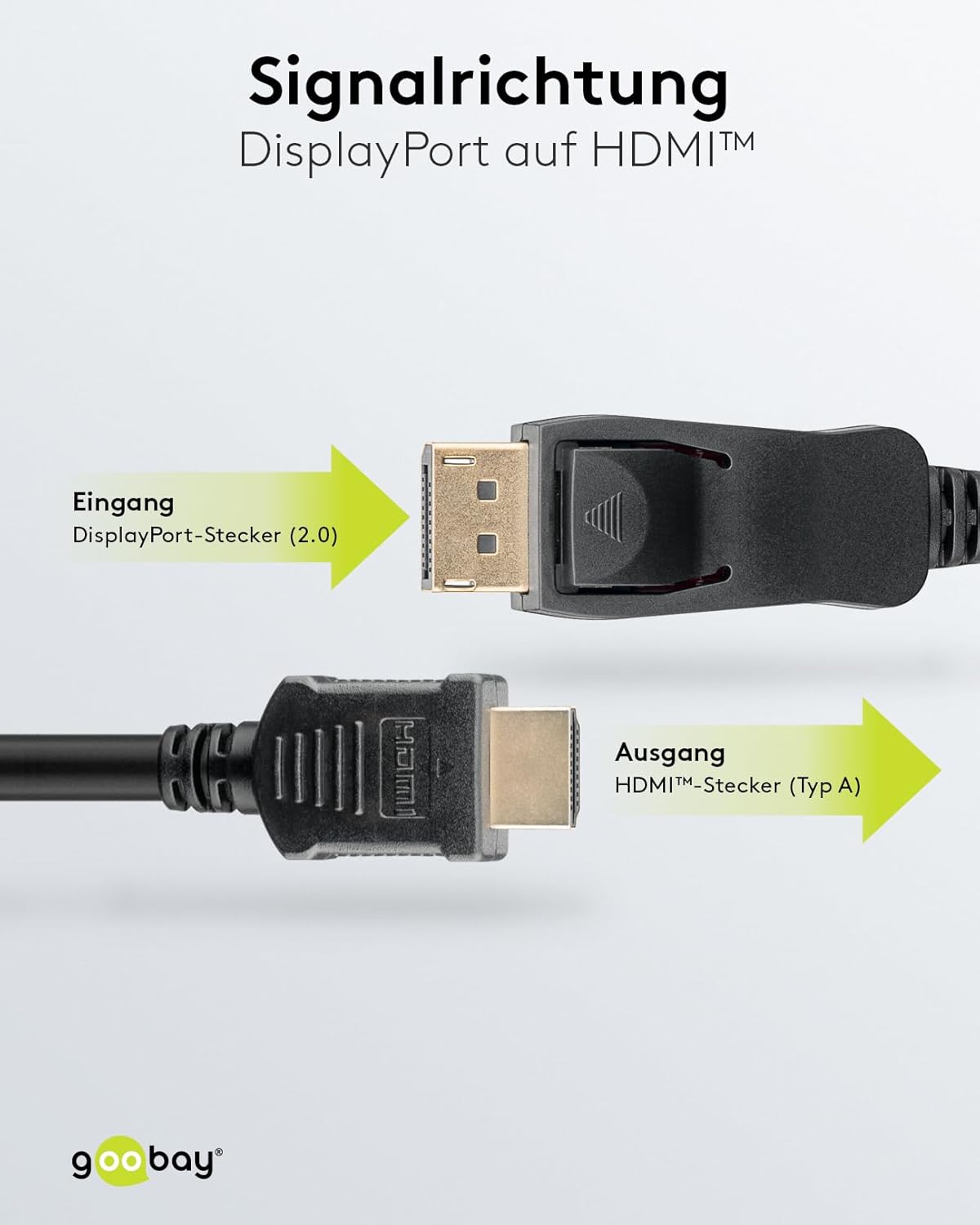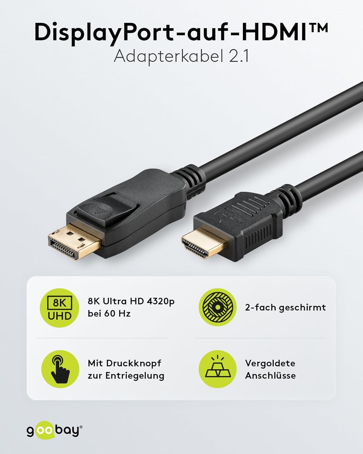 DisplayPort to HDMI Adapter Cable, DisplayPort Male (2.0) > HDMI Male (Type A) (2.1) goobay always has the right electronics accessories to connect your PC or laptop to an external display. Our products transmit maximum quality signals for a crisp image. The robust construction and high-quality materials of our cables, adapters, converters and connectors ensure true colour reproduction. Simple. Everything. Fit! High-resolution UHD signal transmission with up to 8K @ 60 Hz Gold-plated DisplayPort and HDMI connectors guarantee flawless signal transmission, clear sound and crisp video and picture quality. DisplayPort to Ultra High Speed HDMI cable to connect TV, monitor or projector to PC and laptop. Goobay connection cable with mechanical DisplayPort plug lock prevents loose contacts. DisplayPort cable as a simple solution for adding an external monitor (plug & play) Signal direction: DisplayPort to HDMI Technical data Connectors Connector, type DisplayPort male connector 2, type HDMI male (type A) Cable type round cable type 1, shielding aluminium type 2, shielding aluminium inner conductor, material copper diameter cable sheath (approx.) 6mm Cable Length 1m Signal Transmission Supported Video Standards 4K Ultra HD (144Hz) General Color Black Packaging Type Bulk