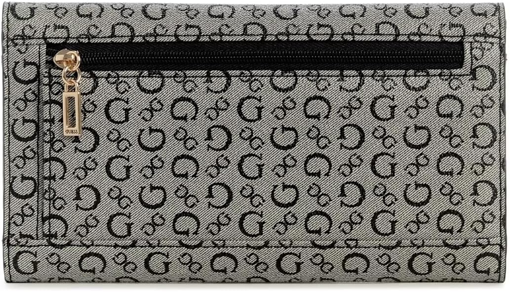 GUESS Factory Women's Rhiannon Fold-Over Clutch Wallet Coated canvas clutch wallet Allover logo print Gold-tone hardware and logo emblem Slim trifold construction Back exterior zip pocket Snap-button closure 12 card slots 3 bill pockets 1 ID window 7.5"W x 4.25"H
