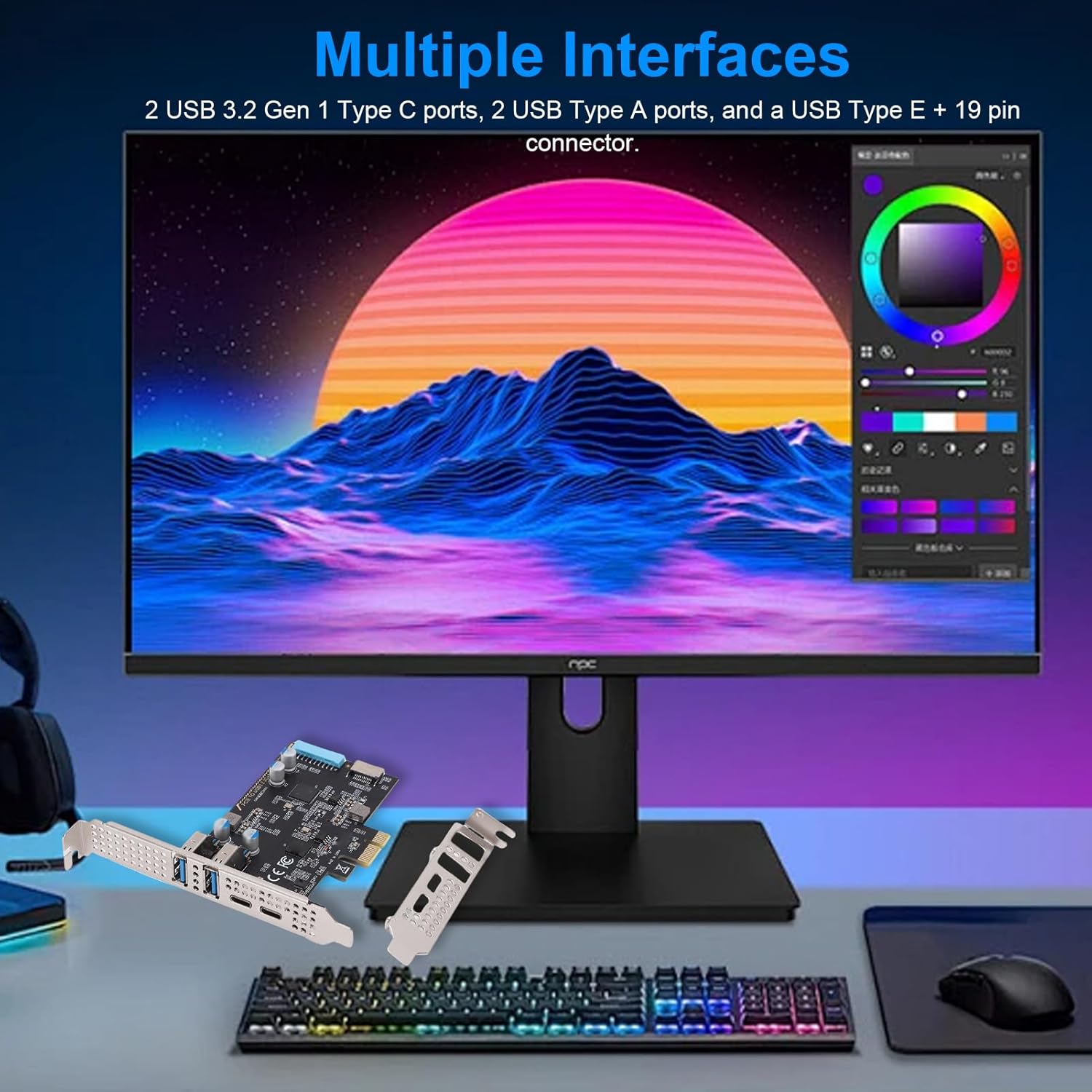 Spec: Item Type: PCIe to USB 3.2 Gen 1 Card Material: PCB Color: Black Bus Type: PCIE Interface Standard: USB 3.2 Gen 1 Front Interfaces: 2 x Type C, 2 x Type A Rear Interfaces: USB Type E, 19pin Bandwidth: 10Gbps Package List: 1 x PCIe To USB 3.2 Gen 1 Card 1 x Low Profile Bracket Notice: 1. USB expansion cards only support data transfer and do not support PD fast charging, video signal transfer (High Definition Multimedia Interface, VGA display conversion), and USB for Thunderbolt protocol.2. In PCIe 2.0 systems, the maximum transfer rate may be lower than PCIe 3.0 or higher versions. 3. Before installation, please make sure to turn off the computer power and disconnect the power cord. 4. When disassembling the chassis, please be aware that there may be incisive edges on the edges of the chassis to avoid scratches.