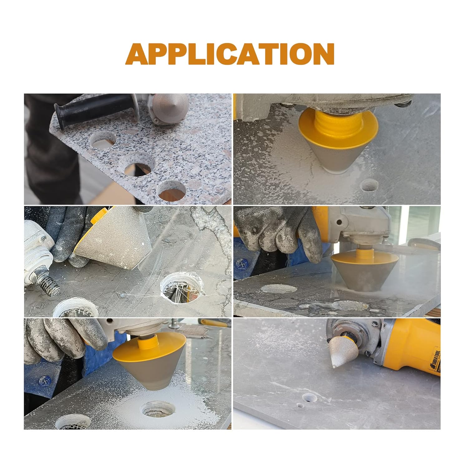 Product Description: Package included: 1pc 2" (50MM) Hex Shank Diamond Beveling Chamfer Bit for Marble Glass Ceramic Countersink Hole Trimming,Hand Drill Feature: 1.Shank: Hex Shank 8.3mm,Chamfer Angle:Top Angle 53 degree,Chamfer Diameter: 35mm,Total length: 62mm,Working Depth:35mm 2.Hex Shank Vacuum Brazed Diamond Beveling Chamfer Bit Set For Holes Trimming Finishing Countersink Ceramic 3.This is not a core bit for drilling. It doesn't make holes but it bevels the hole cleaning and reinforcing the borders when the borders are chipped or need to be clean 4. Diamond bit for a smooth, high-end finish 5. Very useful to reduce the risk of cracking with standard and large format tiles subjected to tension (ex tightened plumbing, led lights etc.) 6. Very useful to improve the edge finishing of exposed holes Application Machine: Can be fixed on hand held Hand/Electric drill Application: Dry or Wet Bevel Ease chamfers and stress relieves rough holes in ceramic,porcelain tiles,Marble Granite
