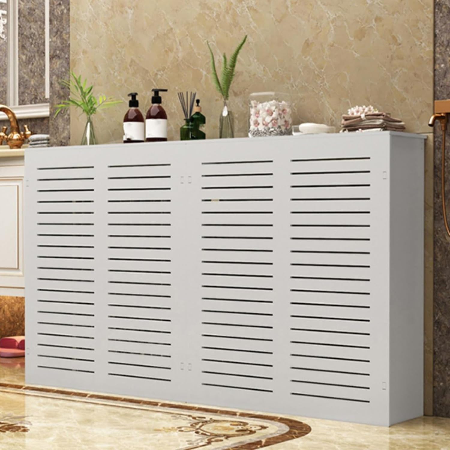 The radiator cover covers the messy pipes, making the home environment more tidy and beautiful. It is especially suitable for situations where the manifold does not match the interior decoration style or the manifold looks old.The top of the cabinet is designed with a large storage space, which can properly place daily sundries and classify and store commonly used items for easy access. While enjoying the warmth, make the home environment more tidy and orderly.The radiator cover uses thickened wood-plastic board to increase the load-bearing capacity of the board. When it needs to bear a large weight or withstand a large external force, the thickened board can better resist deformation and damage, and maintain the stability and safety of the structure.♦ Product details:- Name: radiator cover- Main material: PVC Wood Plastic Board- Color: White- Product Dimension ( W * H * T): 40x60x15cm/16x24x6in , 40x70x15cm/16x28x6in , 40x80x15cm/16x32x6in , 50x60x15cm/20x24x6in , 50x70x15cm/20x28x6in , 50x80x15cm/20x32x6in , 60x60x15cm/24x24x6in , 60x70x15cm/24x28x6in , 70x60x15cm/28x24x6in , 70x70x15cm/28x28x6in , 80x70x15cm/32x28x6in , 80x80x15cm/32x32x6in , 50x70x20cm/20x28x8in , 60x70x20cm/24x28x8in , 60x80x20cm/24x32x8in , 70x70x20cm/28x28x8in , 70x80x20cm/28x32x8in , 80x70x20cm/32x28x8in , 80x80x20cm/32x32x8in , 90x70x20cm/36x28x8in , 90x80x20cm/36x32x8in , 90x90x20cm/36x36x8in , 100x70x20cm/40x28x8in- Room: Living room, any room- Product Care Instructions: Wipe with a Damp Cloth♦ Package Included:Radiator Cover × 1(Front*1+Top*1+Side*2)All Accessories for Installation & Instruction manual