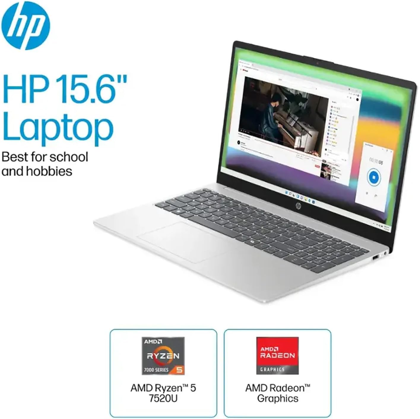 Get A Fresh Perspective With Windows 11 Pro From a rejuvenated Start menu, to new ways to connect to your favorite people, news, games, and content—Windows 11 Pro is the place to think, express, and create in a natural way. Microsoft Copilot Kickstart your creativity and productivity with Microsoft Copilot. Complements your capabilities and creativity with intelligent assistance and relevant answers. And now with the Copilot key, you can access this AI-powered intelligent assistant with a single press of a button. AMD Ryzen 5 7520U Processor Experience a whole new level of speed and power in a laptop powered by AMD. Accelerate your work and your creativity with blazing fast speed. Explore true freedom and flexibility with incredible battery life. LPDDR5 RAM Get responsive performance with the power efficient LPDDR5. Designed to support higher data rates, address next-gen memory requirements, and have longer battery life. AMD Radeon Graphics Whether it’s games or movies, experience high performance for all your entertainment. PCIe NVMe SSD Storage Get up to 15x faster performance than a traditional hard drive. HD Touchscreen Reach out and control your PC with just a touch. Being able to pinch, zoom, tap, and swipe right from the screen makes interacting with your computer a totally intuitive experience. Flicker-Free Using DC Dimming technology that controls brightness by adjusting direct current rather than cycling the backlight, we can eliminate screen flickering for more comfortable viewing. Liberating Battery Life Take on the day without worrying about recharging. HP Fast Charge Go from 0 to 50% charge in approximately 45 minutes. Effortlessly Connected Enjoy faster speeds, improved performance and greater capacity with Wi-Fi 6 and Bluetooth 5.3 wireless card. Tuned Stereo Speakers HP custom-tunes the dual speaker setup in every notebook for exceptional stereo quality. HP True Vision HD Camera Video chat in vibrant clarity, even in low light, and make every conversation a face-to-face experience for a better way to stay in touch. Lift-Hinge Design The new lift-hinge design elevates your keyboard for more natural and comfortable typing. Camera Shutter Stay secure with a physical camera shutter. Video chat with peace of mind with a privacy camera you can close when not in use. Narrow Bezel Display Narrow bezel for optimized display area. Anti-Glare Panel Non-reflective and low gloss means you'll get less glare while you're outside. Microphone Mute Enjoy greater peace of mind and the convenience of a dedicated microphone mute button that you can easily activate and know it’s on or off with an LED indicator light.