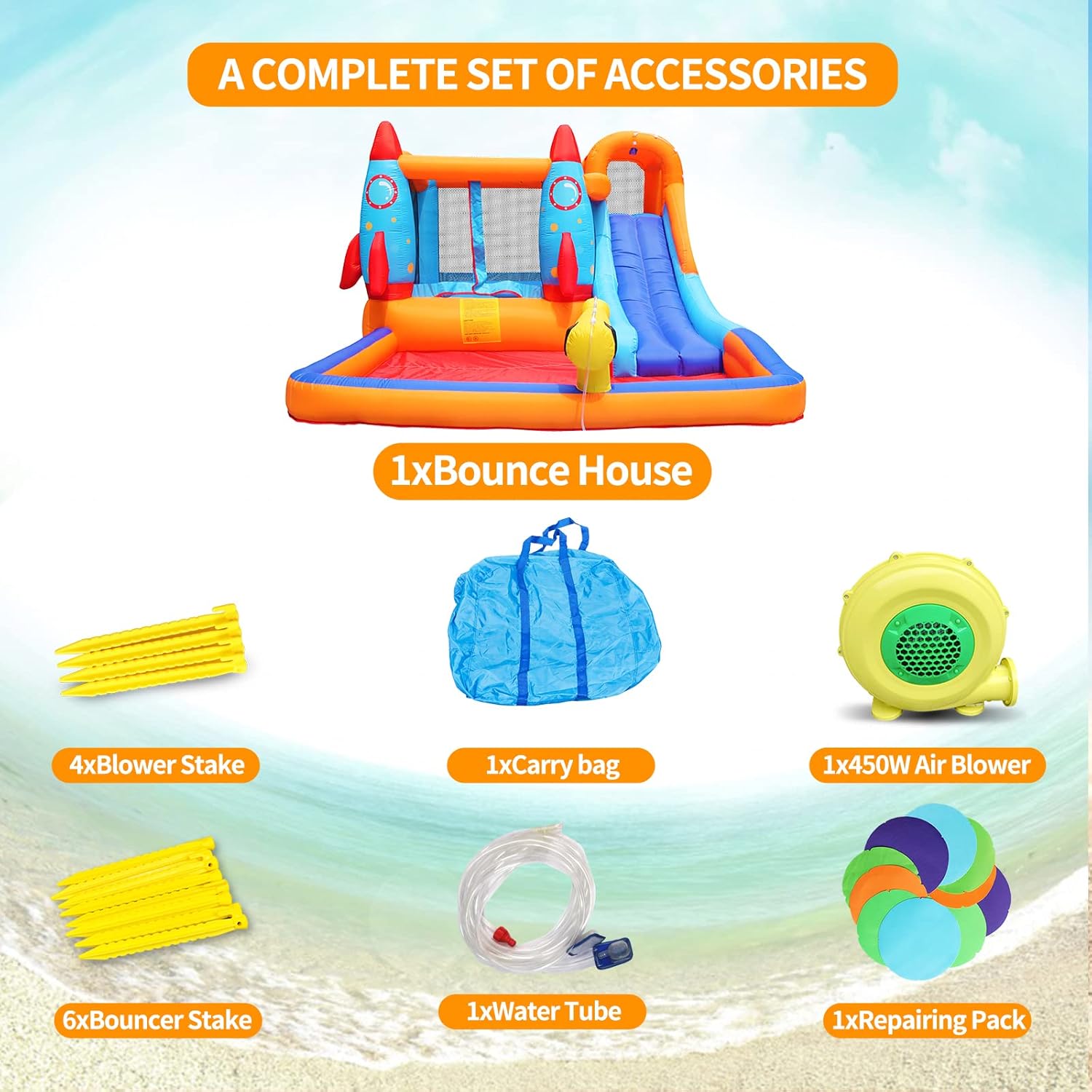 | Included Components | Air Blower, Bouncer Stakes, Carrying Bag, Repair Patches, Rocket Water Slide |