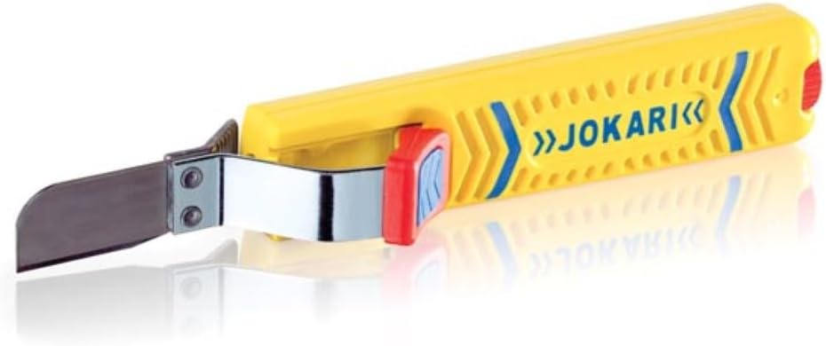 This tool is a quality Product made in Germany by JOKARI. The JOKARI-Krampe GMBH is a leading producer of cable stripping and de-insulating technology. JOKARI produce since more than 40 years specialist tools for a wide range of applications that allow simple, fast, and precise cable stripping. Proven a million times over, the JOKARI cable knife is the tool of choice for stripping all standard round cables. Each JOKARI cable knife benefits from special Titanium-Nitride coating (TIN) to achieve longer life, faster cutting, and less wear. A practical extra is the spare blade with TIN coating included in the handle. The Secure No. 28G is a cable knife with 2-Compound Design for stripping most common round cables from 5/16 - 1.1/8" (8-28 mm) Ø and additional straight blade. The unique feature of this knife is the slip-proof handle grip with soft thumb protector. The user benefits from a more secure grip achieved by the non-slip padding.