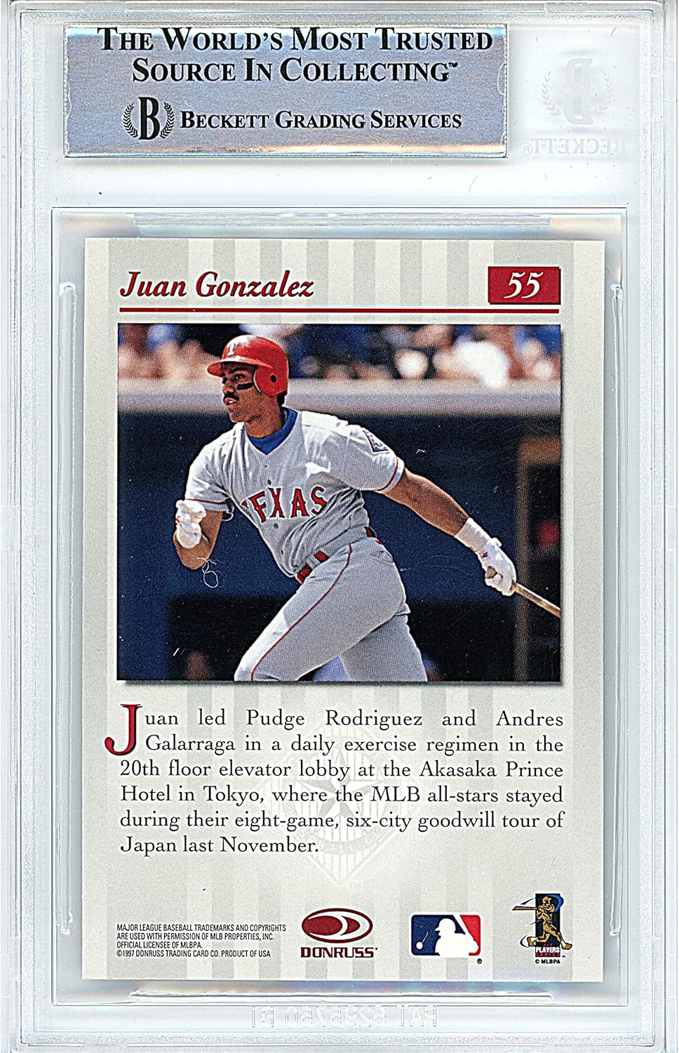 Add a classic MLB autograph collectible to your collection with this Juan Gonzalez signed and autographed 1997 Donruss Studio baseball trading card, Number 55. This Baseball Trading Card Slabbed presentation is professionally encapsulated by Beckett Authentication Services (BAS) for long term protection and a clean, display-ready look. A great fit for Texas Rangers fans and collectors, this authenticated card also connects with Juan Gonzalez team collectors from the Detroit Tigers, Cleveland Indians, and Kansas City Royals years. For buyer confidence, the authentication number shown in photos and verifiable in the Beckett database. Display it in a display case or on a shelf display, or store it neatly in a card holder for your office or man cave. Whether you’re building a player collection or shopping for a baseball gift, this BAS authenticated slabbed trading card is an easy addition to any sports memorabilia lineup.