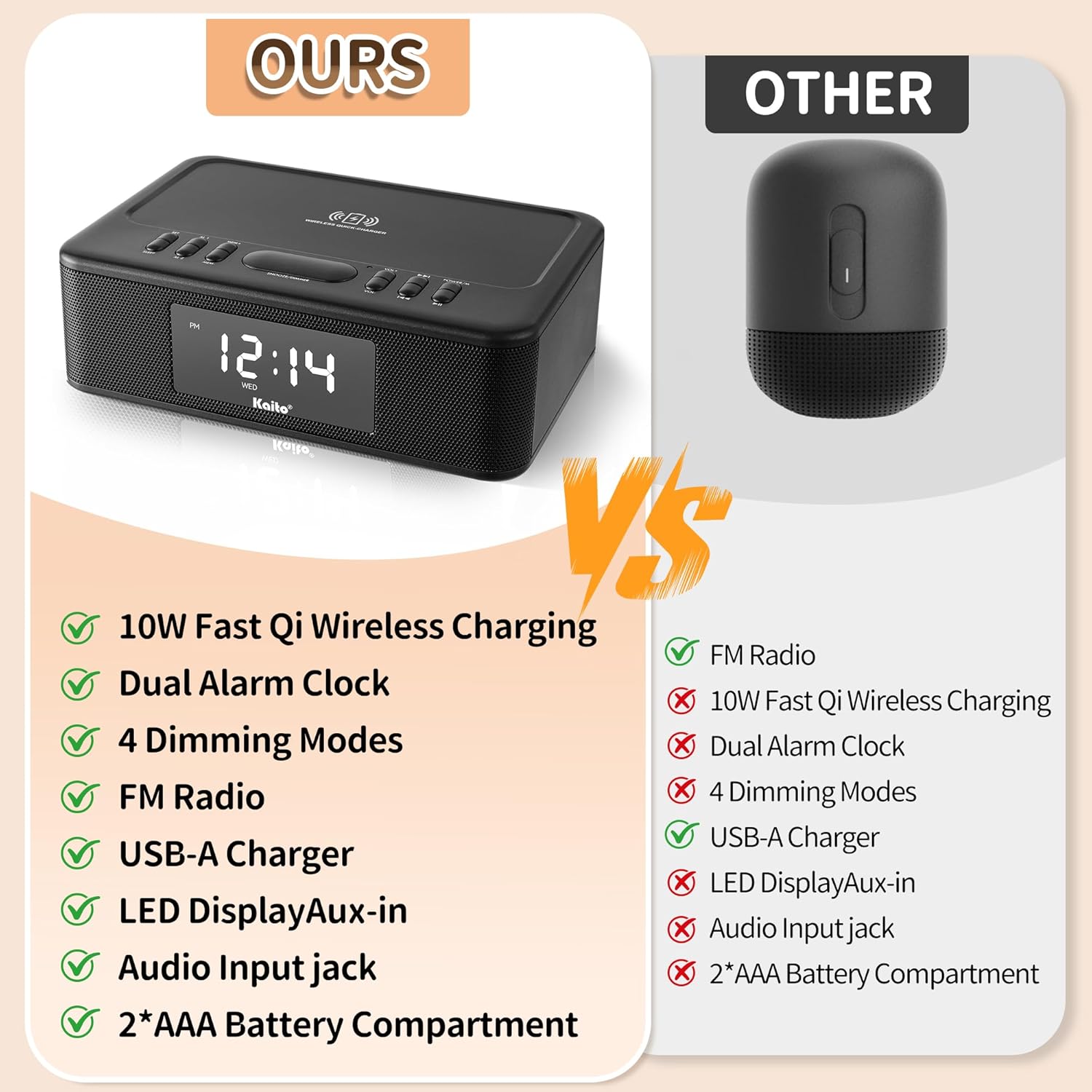 Kaito KA718 Voyager Home Bedside Alarm Clock Radio with Bluetooth Speaker & Wireless Mobile Charger, Black