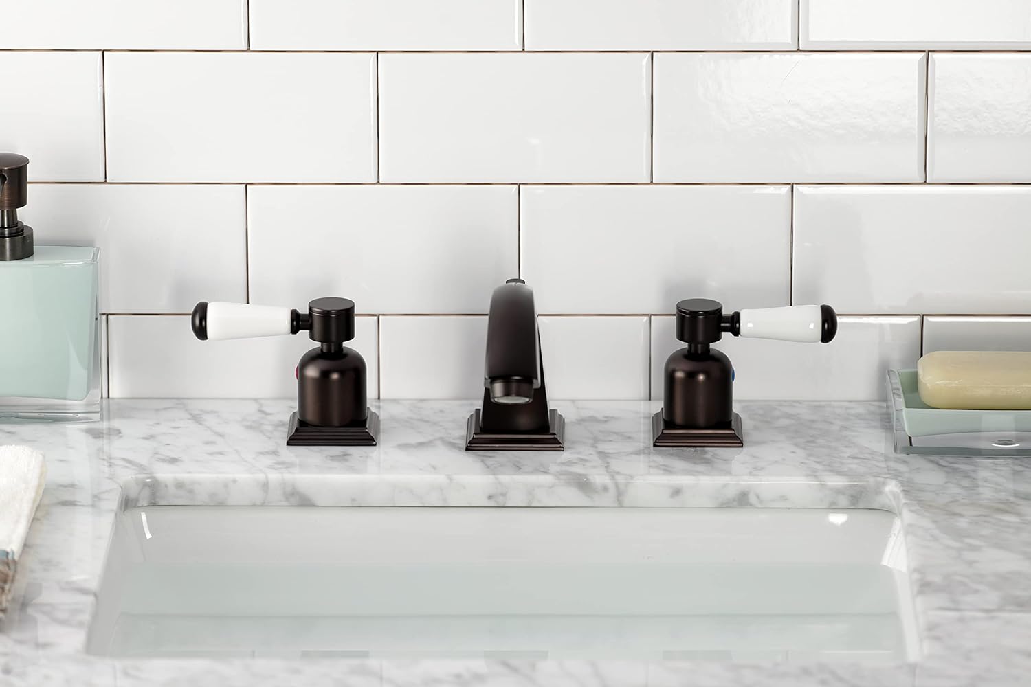 Crafted to bring aesthetic beauty alongside exceptional performance, the feature of porcelain lever handles and rounded architecture solidifies pristine refinement in this faucet. Ideal for more spacious bathrooms, widespread faucets are more spread apart and feature a 3-hole installation. The Paris 8-inch widespread bathroom faucet and its featured sturdy brass construction and premium oil rubbed bronze finish are guaranteed to glamorize your home's modern ensemble for years to come. Embolden your home ensemble with the addition of this exquisite fixture. A matching finish drain is also included.