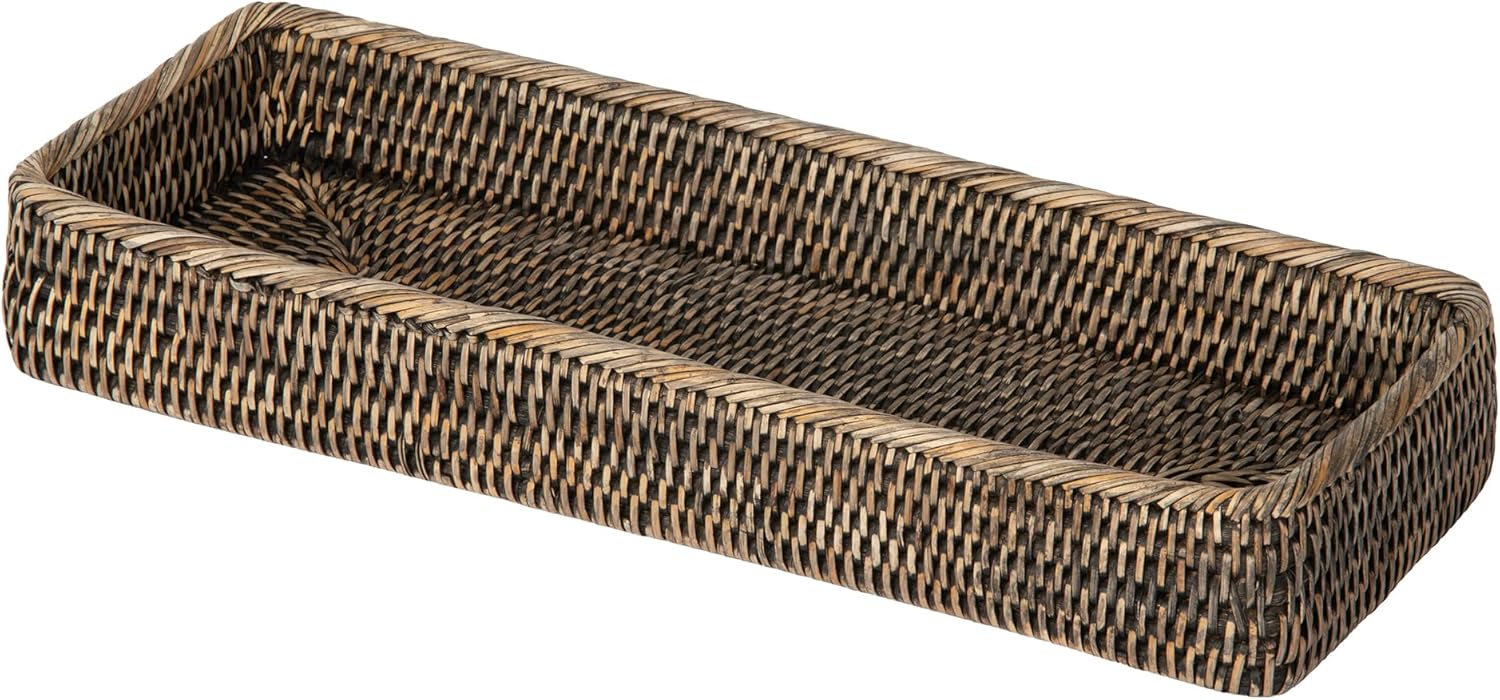 If you like your bathroom countertop organized, this vanity tray hand woven from rattan in a cool white washed color tone will hold your lotion bottles, hair brush, face towels and so much more
