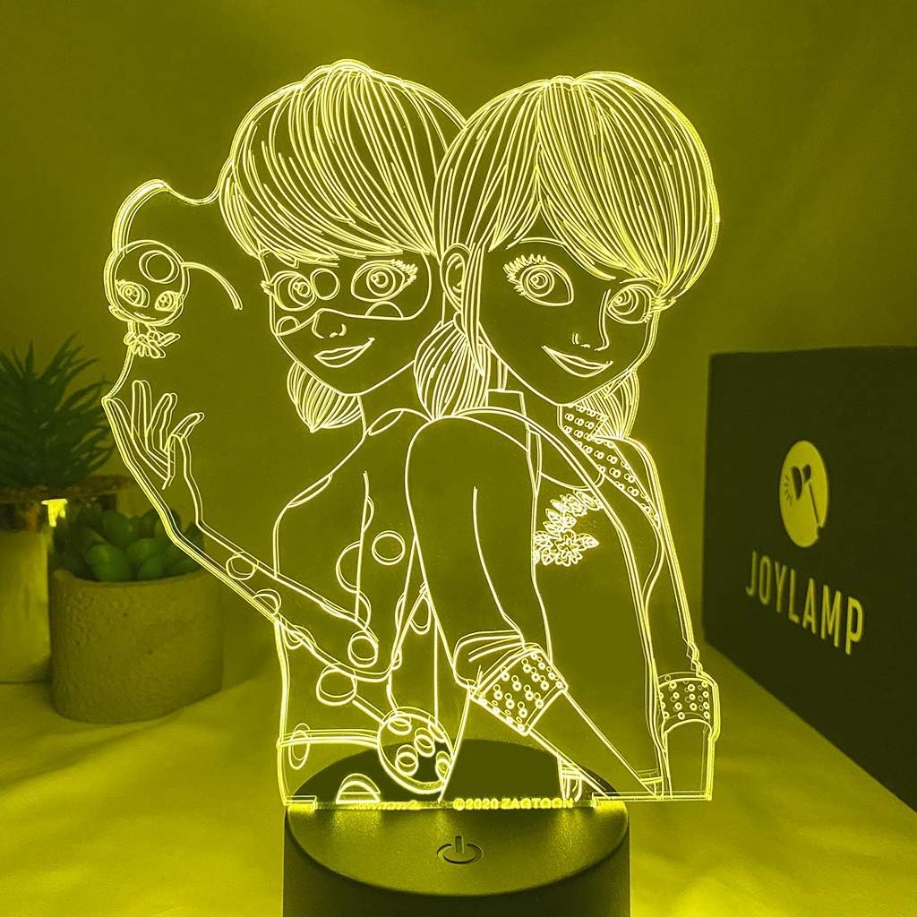Discover the JoyLamp Ladybug and Marinette from the official Miraculous x JoyLamp collection through 16 colors and 4 automatic change modes The JoyLamp Ladybug and Marinette is composed of a black base, a remote control, an acrylic plate, a micro usb cable and a user's manual The remote control offers you a multitude of possibilities: 16 colors + 6 brightness tones for each color to perfectly adapt the JoyLamp to the desired mood Change the color from a distance of more than 10 meters and change multiple JoyLamps with a single remote control Enjoy 4 different modes and rediscover your JoyLamp: Smooth, Fade, Strobe and Flash Turn your JoyLamp off or on The remote control saves the state in which you turned off your JoyLamp Are you far from your remote control? A touch mode is available and allows you to control your JoyLamp by tapping on the base: Press the touch button once to change the color. If you tap 8 times, the colors will automatically change. Press and hold the button for at least 2 seconds to turn off the JoyLamp.