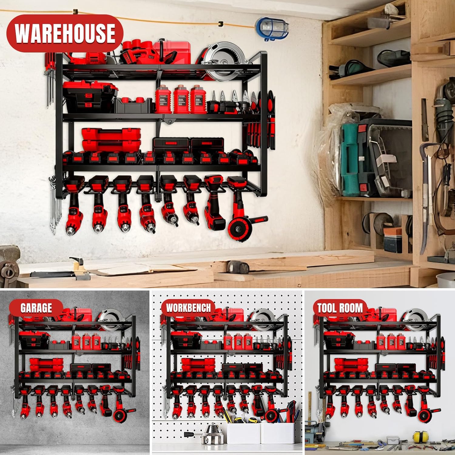 • 4 Layer Large Capacity Power Tool Organizer: It features a four-layer large capacity design, with items placed in separate layers for easy to access, saying goodbye to clutter and improving efficiency. The upper layer is for different types of battery and toolboxes, the middle layer holds power tools, the bottom layer can hang 8 cordless drill holders, and the side rack can also store pliers, screwdrivers, and wrenche