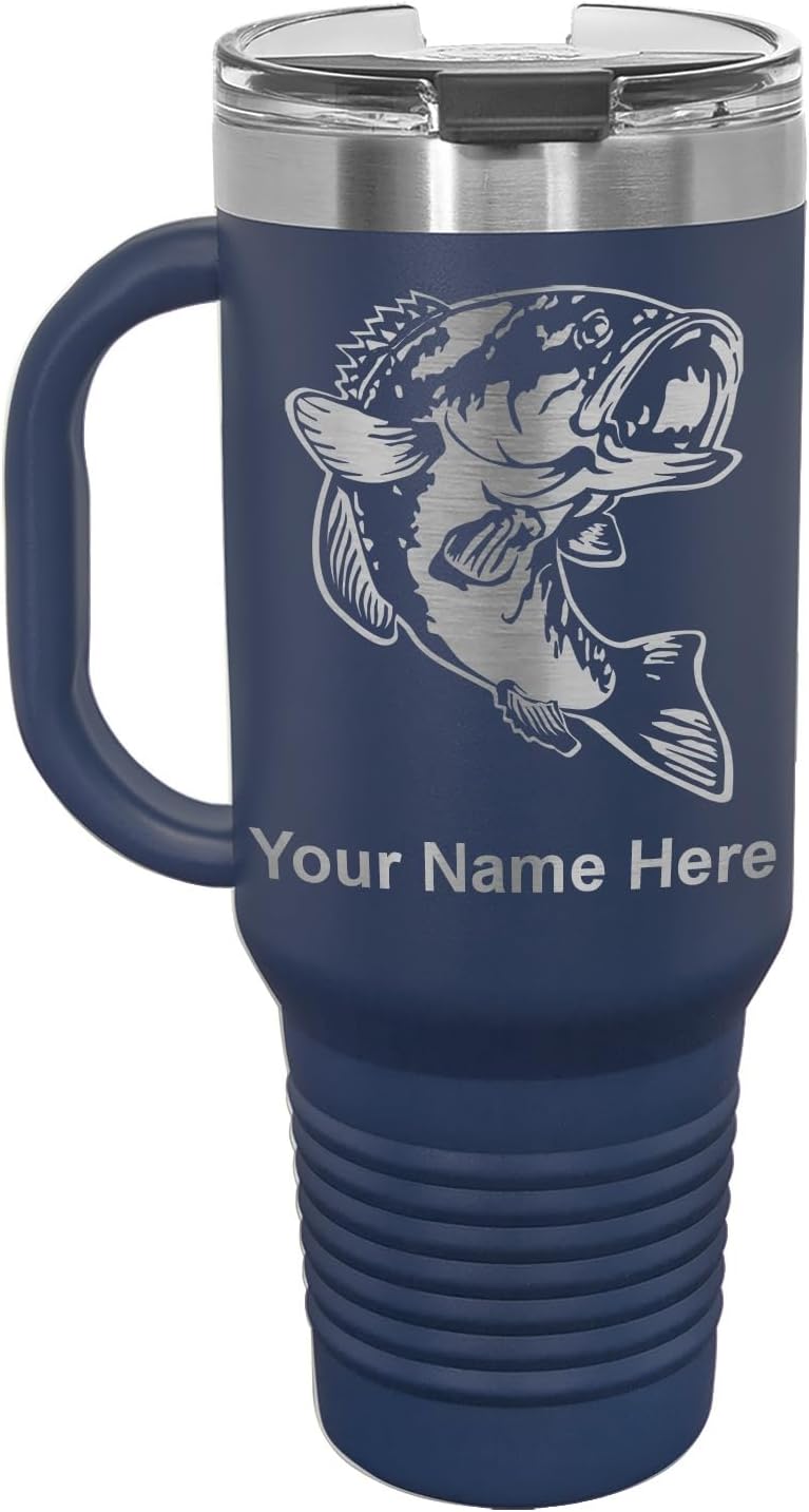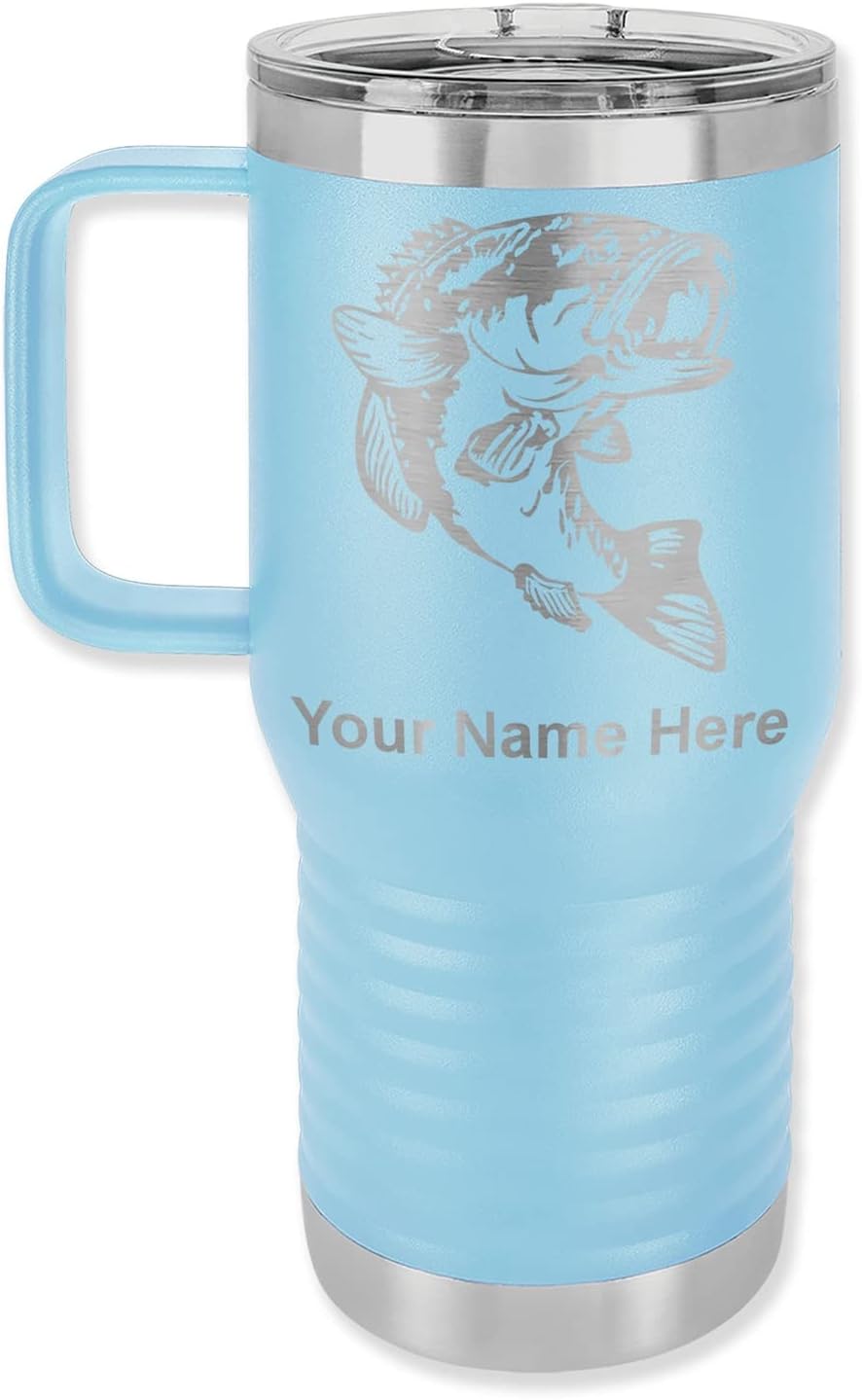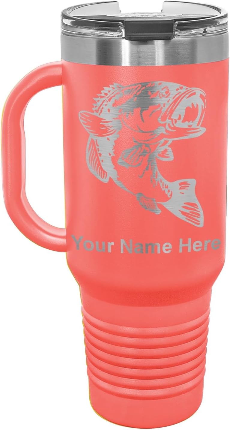 LaserGram 40 ounce Travel Mug with Handle that is laser engraved with the image that you see in the photo. Your own personalized text will be laser engraved below the image. Features double-walled stainless steel vacuum insulation with a clear lid. Click the "Customize Now" button to begin customizing your mug.