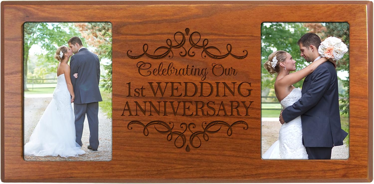 Honor the happy couple with a personalized 1st wedding anniversary photo frame. A treasured and lasting personal keepsake for wedding or anniversary. 1st Anniversary picture frame can be hung on wall or displayed on table. This special keepsake anniversary gift will always be a wonderful reminder of the love that you have for one another. Honor the happy couple with a 1st wedding anniversary decorative wood photo frame holds 2- 4x6 photos. Words are laser engraved.