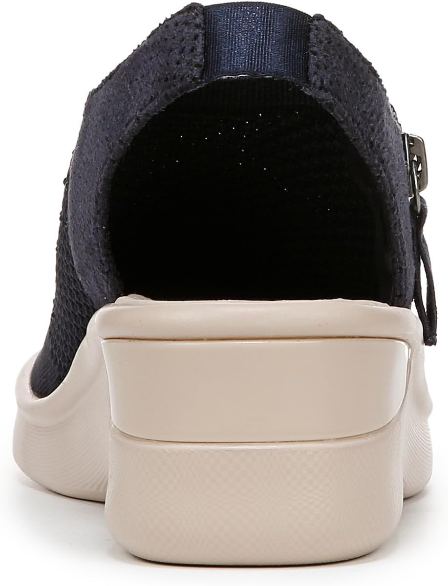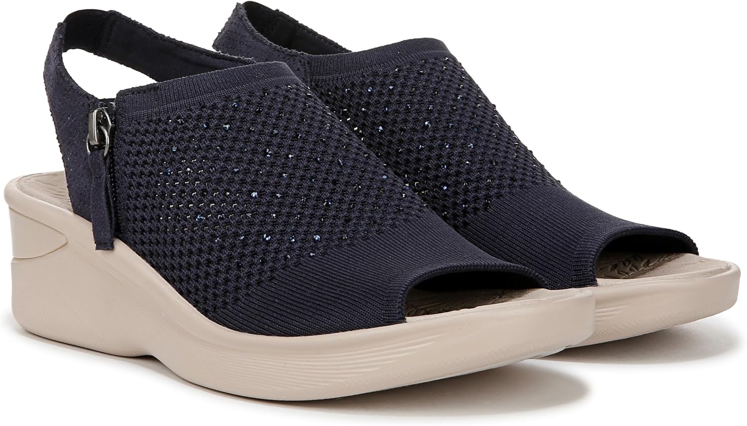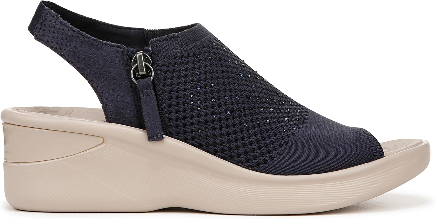 Bring on the bling! Level up your looks in these slingback sandals with rhinestone details, a zipper, peep toe and wedge heel. Stretch engineered knit upper with a round toe. BZEES Air Step Technology: Designed so you’ll feel weightless, energized and free. Ultra Lightweight: Step lightly with a nearly weightless feel. Dynamic Stretch Fabrics: Move freely in shoes with built-in stretch. FreeFoam™ Comfort: Low pressure insoles with maximum foot contact and cushy arch support. Odor Control technology. 3/4 inch platform, 1 3/4 inch wedge heel. Get Width It: Countless pairs of Bzees come in wide width shoes for women. Machine Washable: Wash on cold and air dry.