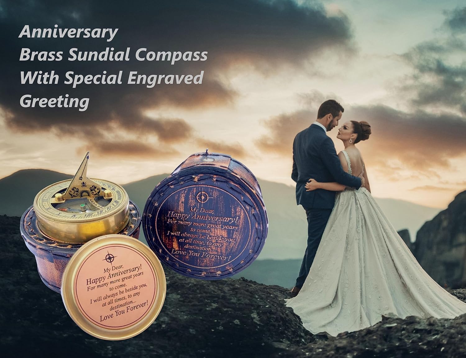 Embrace the spirit of adventure and timeless romance with the MADSNIIB Brass Sundial Compass, a unique blend of classic craftsmanship and functional design. Handcrafted from premium-quality brass, this vintage sundial compass is a perfect accessory for those who appreciate the charm of antique steampunk style. Designed to serve as both a sundial and a compass, it offers dual functionality for navigating by the sun and the magnetic fields, making it an ideal companion for touring, hiking, camping, or any outdoor exploration.This exquisite sundial compass features an elegant engraving with the heartfelt message "Happy Anniversary," making it a thoughtful and meaningful gift for loved ones. Whether celebrating a wedding anniversary, an engagement, or any special occasion, this compass serves as a lasting symbol of love, guidance, and the beautiful journey shared together. Its compact size and durable construction make it easy to carry in a pocket or backpack, ensuring it is always ready for your next adventure.The MADSNIIB Sundial Compass is not just a practical tool for the outdoors; it is also a stunning piece of décor that brings a touch of vintage charm to any space. Its intricate detailing and antique finish evoke a sense of history and nostalgia, making it an eye-catching addition to any desk, bookshelf, or mantel. This handcrafted accessory embodies the spirit of exploration and discovery, reminding us to cherish every moment and seek new experiences.