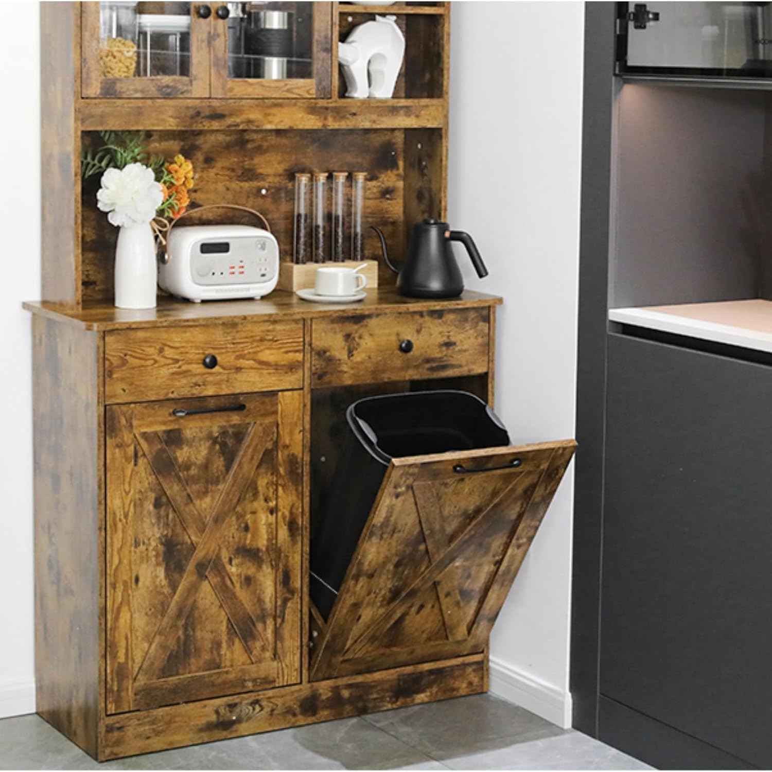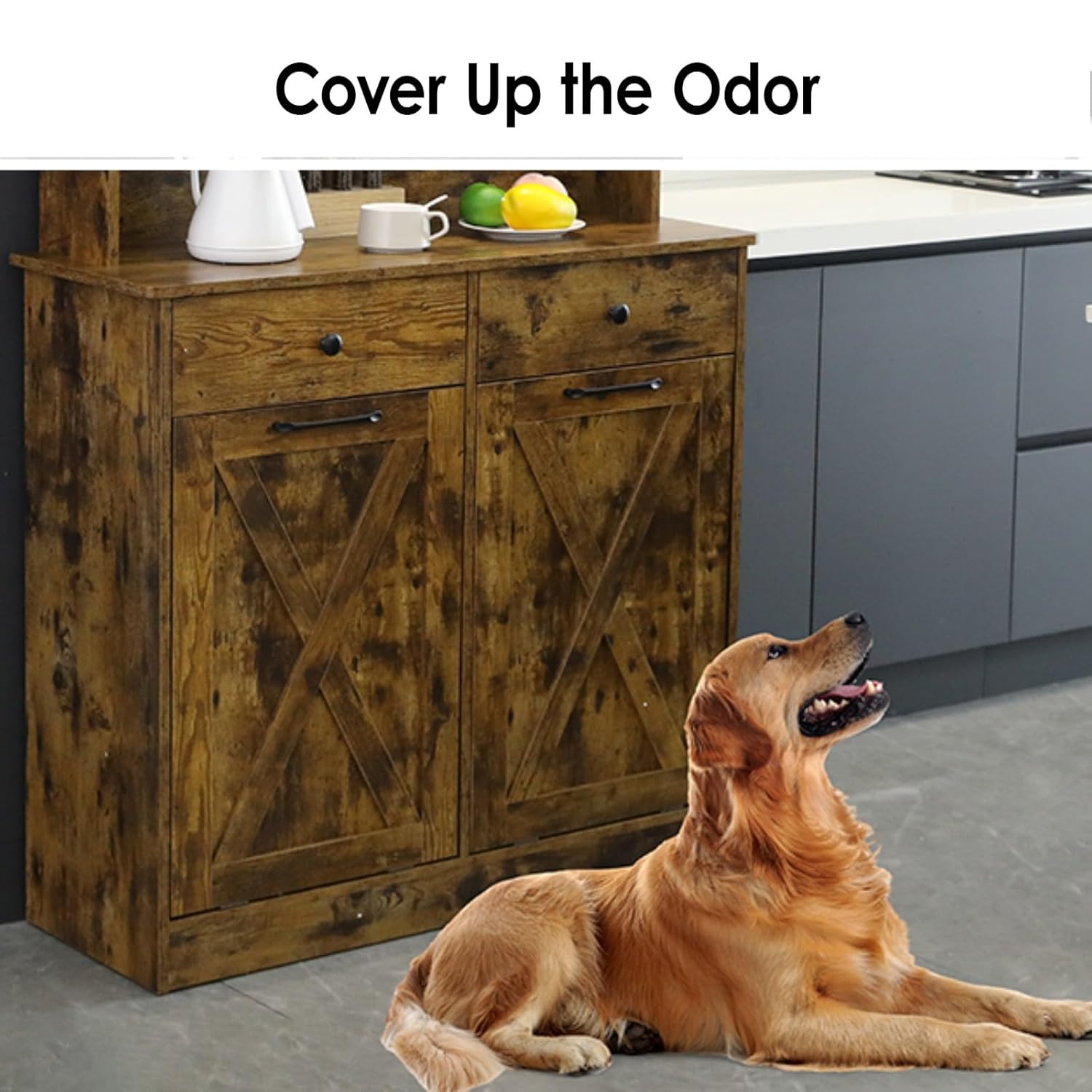 Description:This Kitchen Bin Cabinet offers a beautiful solution to your extra storage and trash sorting needs and features a texture pattern that will accent any corner of your home.- As extra kitchen island for busy cooking times-2x10 gallon capacity for recycling, trash, laundry, pet food-Hidden trash can, no more fear of being knocked over by pets-Modern style bin cabinet designed for den, pantry, lounge, patio, garage, dining room-Tilt and drawer trash cabinet with freestanding solid wood table top. Closing doors provide a perfect odor barrier.-Equip each cabinet with anti-tilt straps to prevent pets from tipping over.-Made with flat, crust-free solid wood that is clean and sturdy and easy to clean even in the kitchenHalf-round stainless steel hinges-No need to worry about humid climate, hinges won't rust, perfect for kitchen, living room, next to washing machine