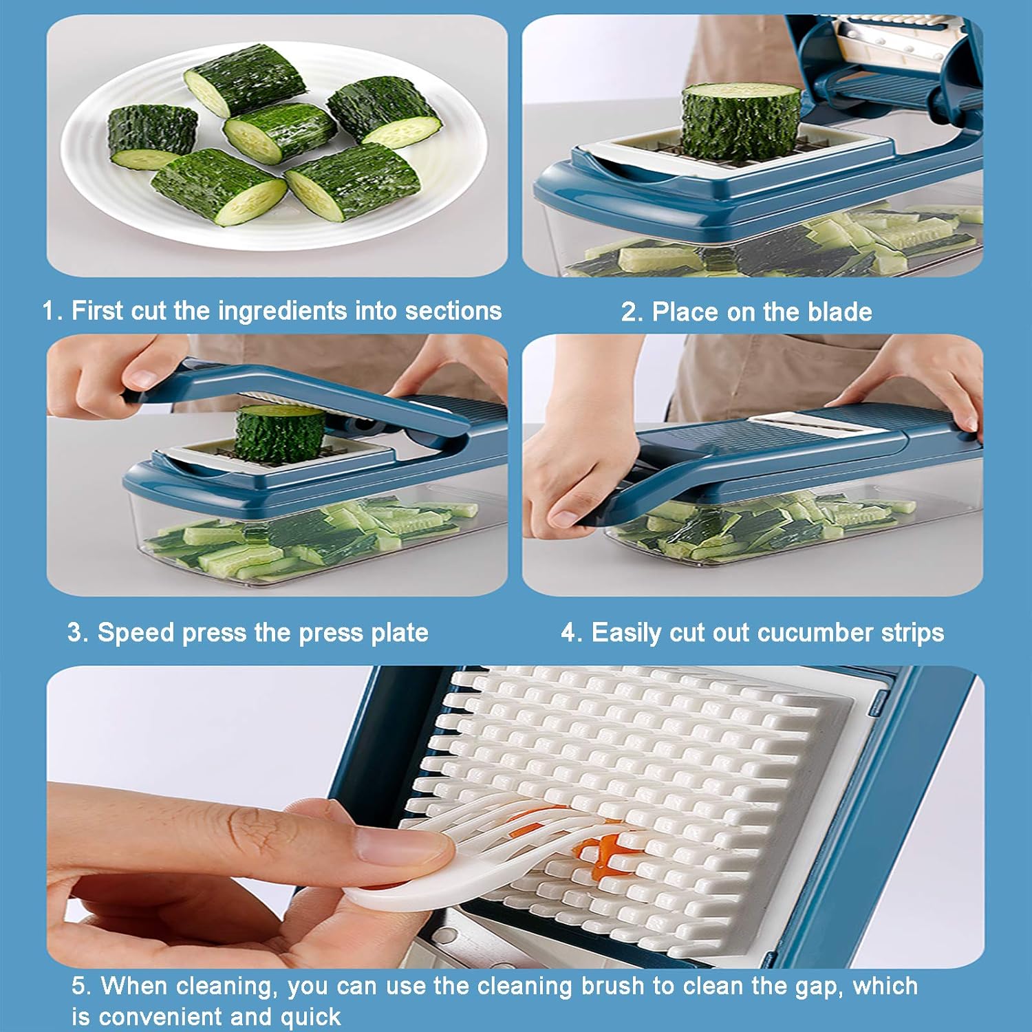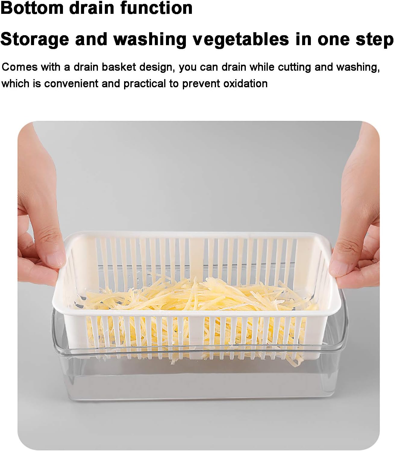 Convenient cooking. Take advantage of life with the use of vegetable slicer. The food cutter is your good helper in the kitchen. Multiple blades. 9 blades to choose from. Make the fruit and vegetables new tricks. Let your taste buds move and dance. High quality and safety. From product material to finished product quality, BPA free, food grade hardened ABS plastic and stainless steel. Make sure you can use our product safely. Compact and large capacity. Compact appearance for space-saving food storage. Easy to clean. After cutting vegetables and fruits, it is recommended to clean the knives with tap water. Please be careful when cleaning the blades. Note: - Use a hand guard to attach when chopping food. - For hard skin, vegetables and fruits, peel it off first. - Do not immerse in water for a long time, please cut it into clean food. Package includes: 1 x Vegetable Cutter 9 x Blades 1 x Cleaning Brush 1 x Hand Guard 1 x Water Filter Basket If you have any questions about this chopper, please contact us.