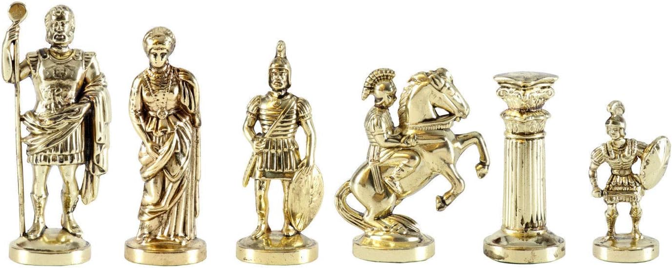 The theme for this beautiful chess set from Manopoulos is inspired by the Greek-Roman period. The combination of top quality and good prices made Manopoulos company world known for their products. Greek sculptors loved to recreate this divine conflict through their art. This period was characterized by fierce local as well as international wars. The aggressiveness of the Pawn and the Knight fully represent the ferocity of these wars. The posture of the King and Queen indicates their unquestionable leadership. The Bishop reveals his consideration for the movements of the imminent battle. Finally, the Castle is a reproduction of a pillar which characterized the architectural style during that period.(F11) Chess pawns details: Condition: New, Handmade in Greece. King Height: 3.8"(9.7 cm) King Base: 1.375" Pawns material: Brass and Nickel Plated cast Zinc * Does not include chess Board (Check our store for great Board offers) *