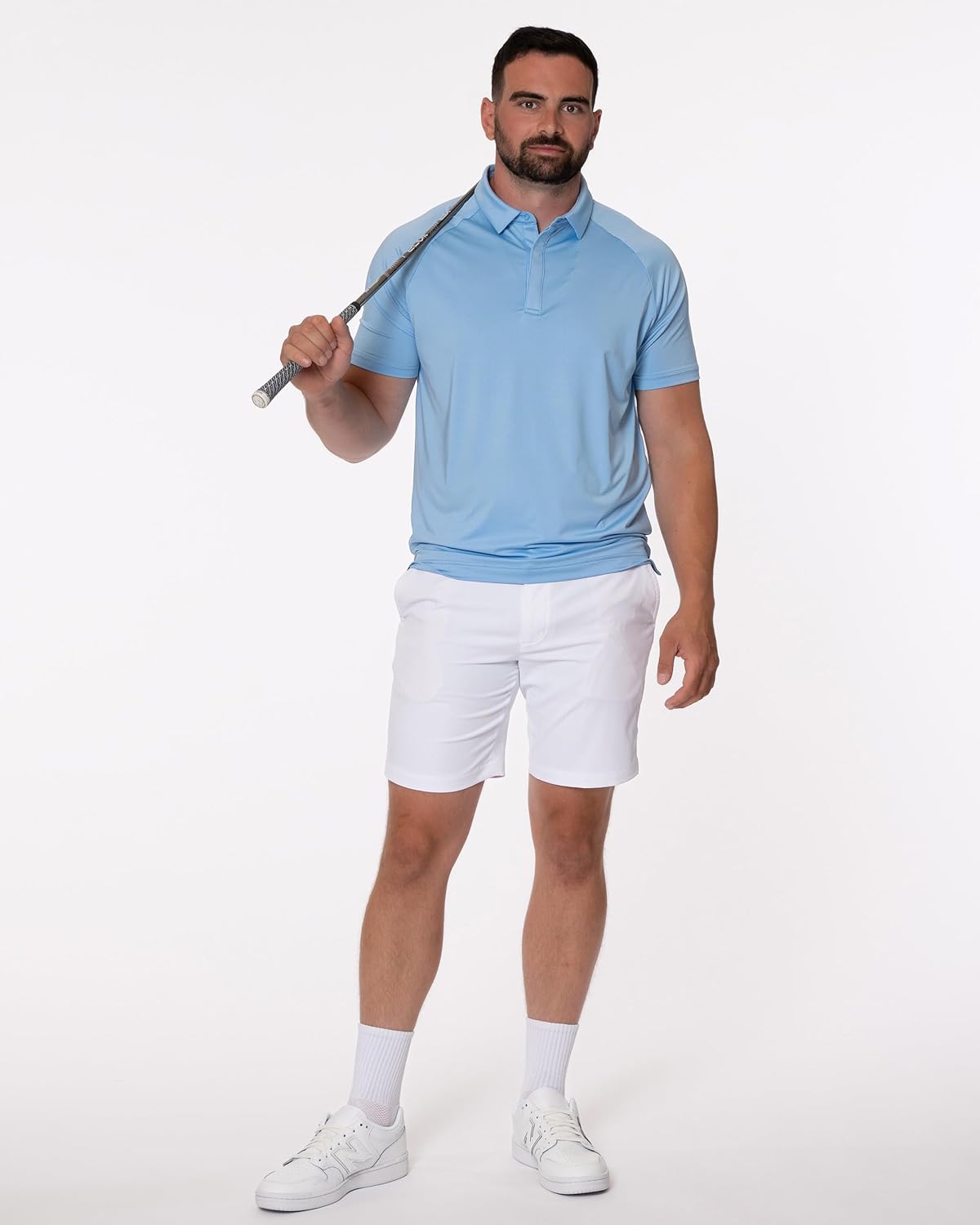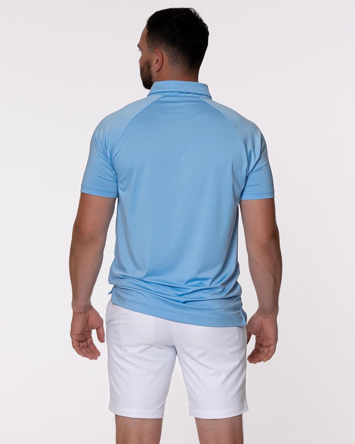 Elevate your golf game with our men's performance polo. Designed with your style and comfort in mind, it features a lightweight, moisture-wicking fabric to keep you dry and cool, no matter the time of year. The 4-way stretch material and raglan sleeves allow unrestricted movement, so you can focus on perfecting your swing without distractions.