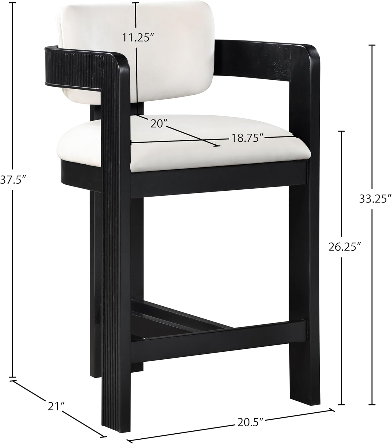 Elevate your counter seating with the Sacha cream velvet upholstered counter stool, a perfect blend of refined texture and timeless craftsmanship. Wrapped in a soft, striking 460 GSM velvet, this stool offers both depth and sophistication. The solid wood frame, finished in a black tone, showcases elegant fluted detailing, adding a touch of classic artistry.