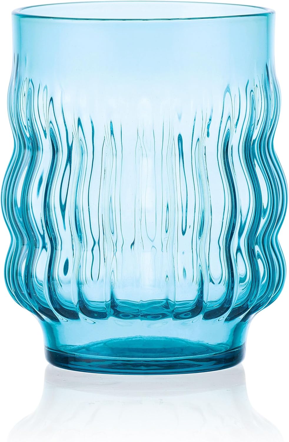 This Waves Blue Set of 4 Double Old-Fashioned Glasses by Mikasa features a sophisticated, wave-inspired pattern and a splash of color, adding an elegant touch to your table setting. Beautifully crafted of glass in a variety of rich, blue tones that fit seamlessly with any decor, these visually intriguing glasses can be used to serve a variety of cocktails or cold beverages. Designed to be stackable, these glasses save space in cabinets, making them perfect for compact kitchens or stylish storage solutions. Set of 4, each measuring 4 inches high with a 3-inch diameter and a 12-1/2-fluid ounce capacity. Dishwasher safe.